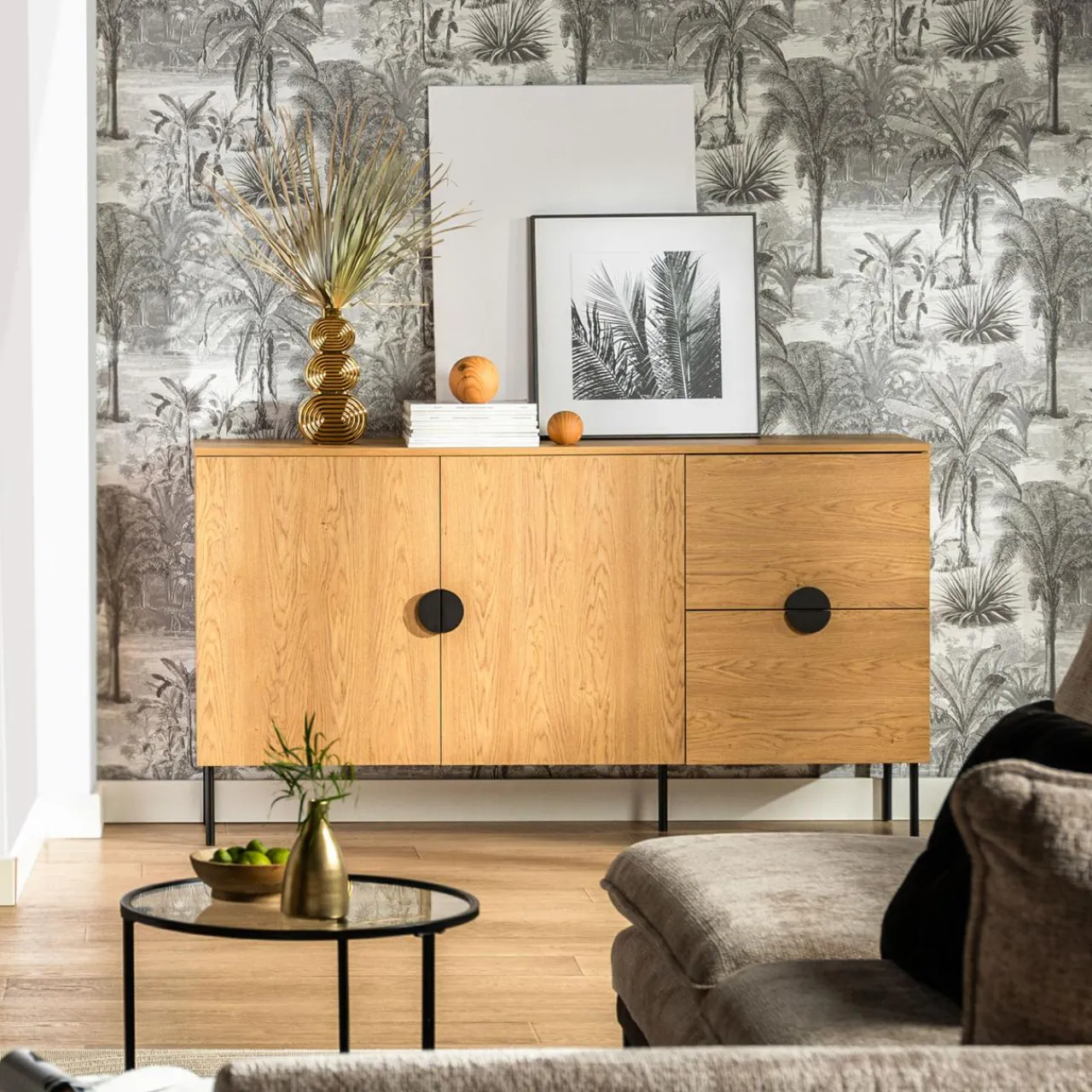 - Półokrągłe metalowe uchwyty wyraźnie odznaczają się na frontach, tworząc kontrast dla ciemnych mebli.
