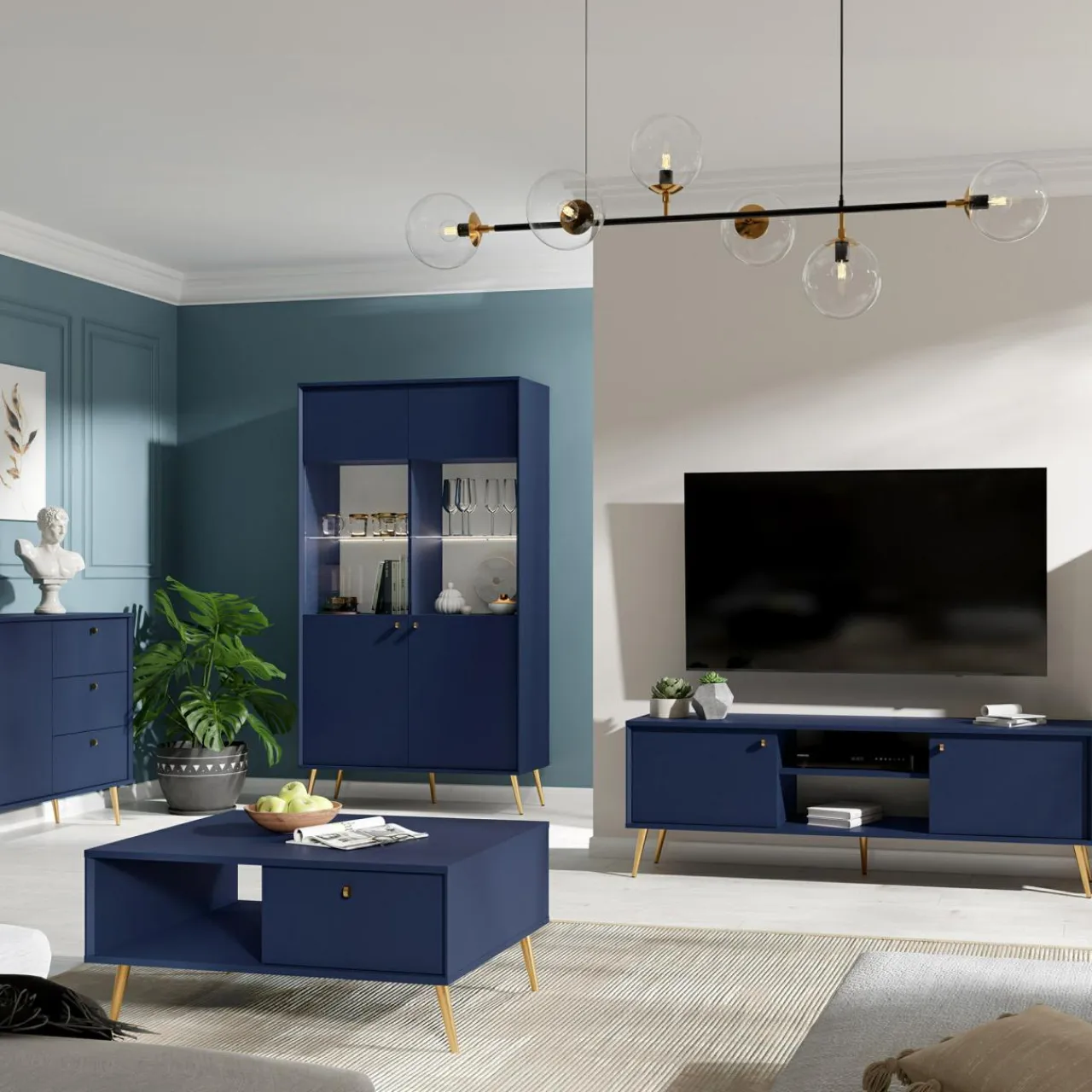 - Granatowe meble stworzą wyjątkowe wnętrze w stylu glamour, marynistycznym czy new hampton.
