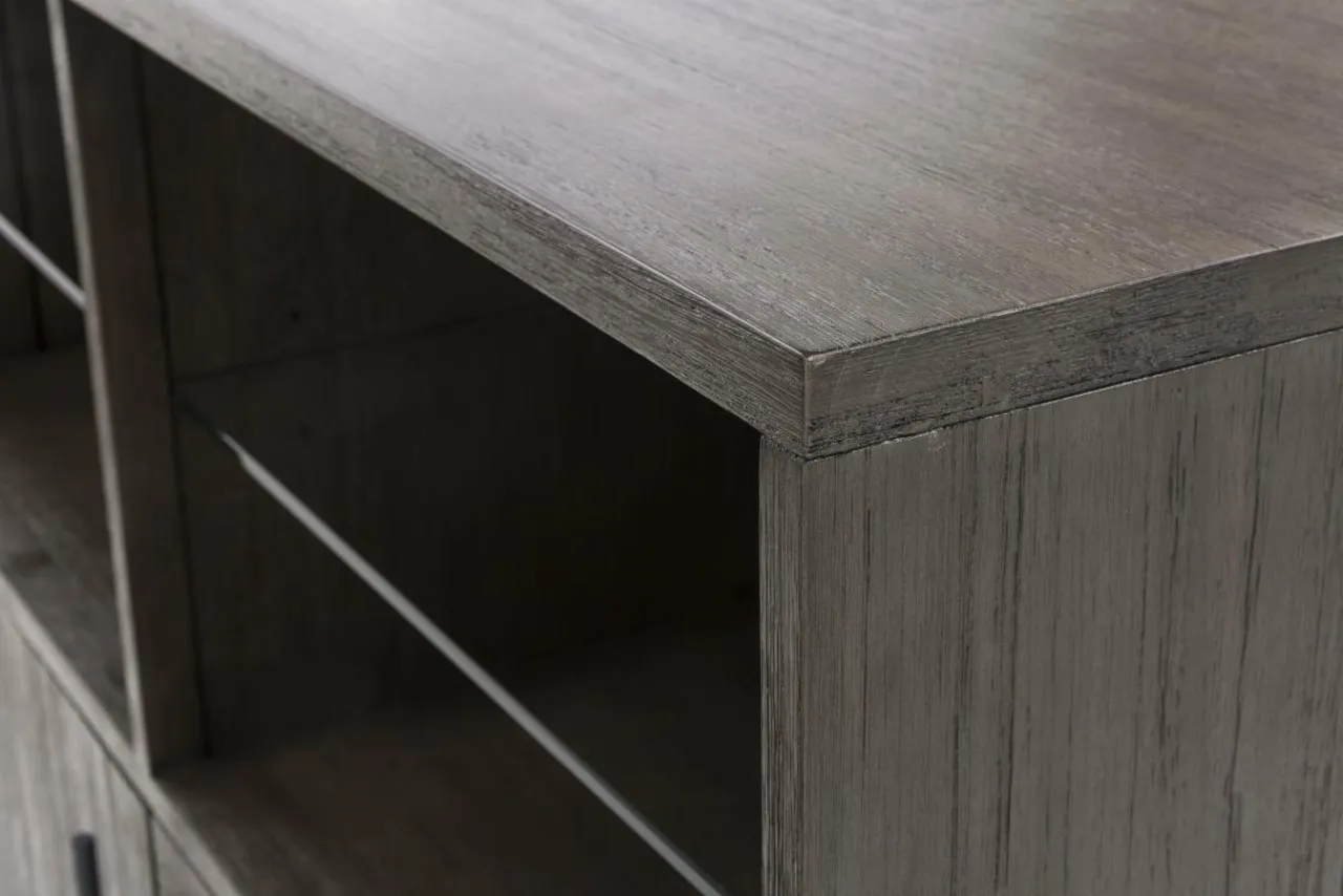Komoda składa się z 4 otwartych wnęk, przedzielonych szklanymi półkami, które posłużą do wyeksponowania książek, interesujących dodatków czy szkła. 2 praktyczne szuflady oraz 2 zamknięte wnęki posłużą do przechowywania różnych drobiazgów – dodatkowych sztućców, obrusów, serwetek czy innych akcesoriów przydatnych w jadalni lub salonie. Dla większej wygody użytkowania drzwiczki zostały wyposażone w zawiasy z cichym domykiem.