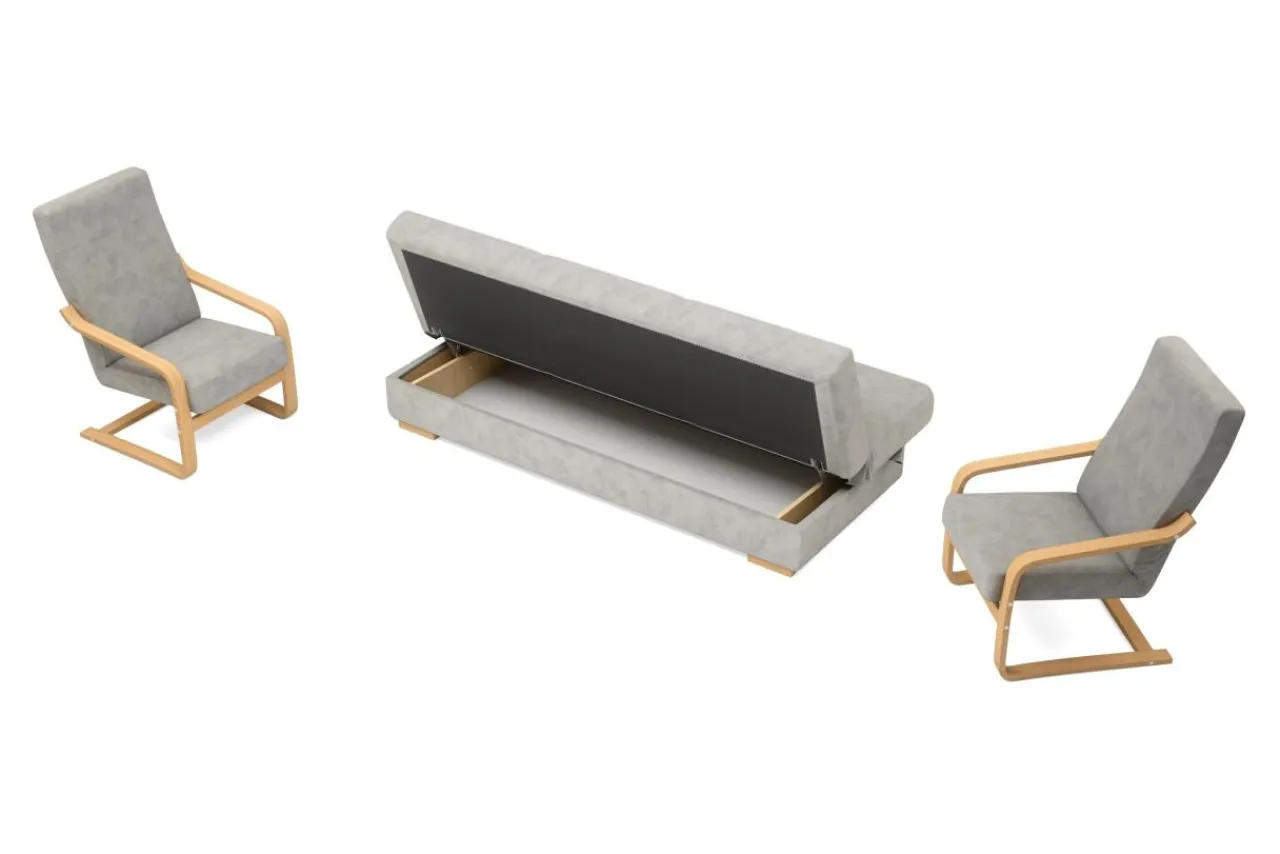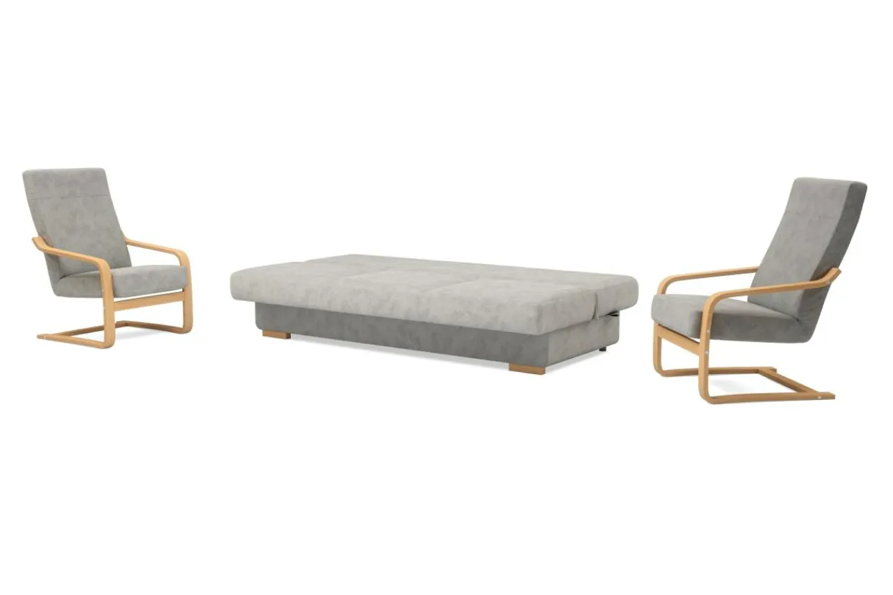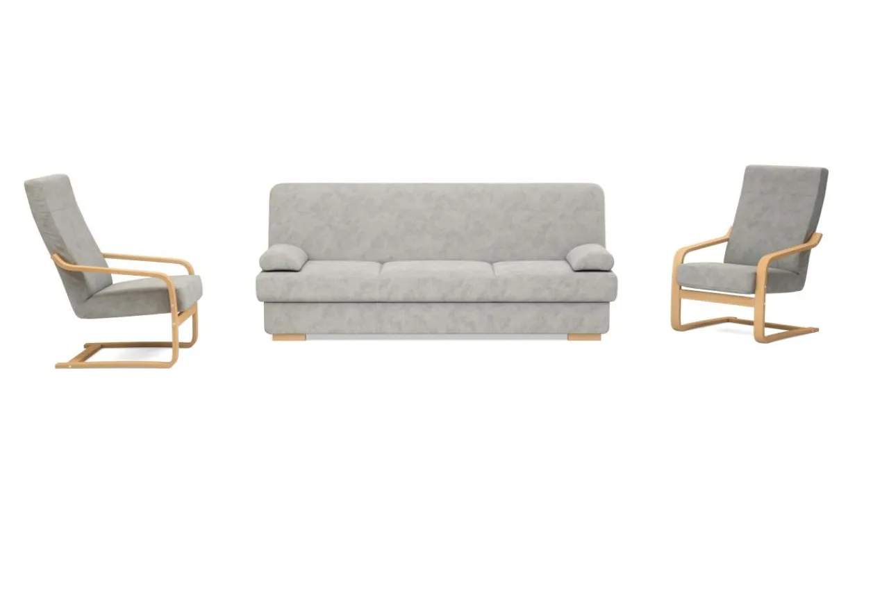 Zgrabna wersalka i dwa fotele na płozach zbudowanych z elastycznego i trwałego stelaża drewnianego to komplet z którego skorzysta aż pięć osób. Wersalka posiada funkcję spania z mechanizmem wersalkowym typu „klik-klak”. Pojemnik na pościel znajduje się pod siedziskiem. Drewniane płozy fotela dodają uroku i podkreślają charakter mebla.