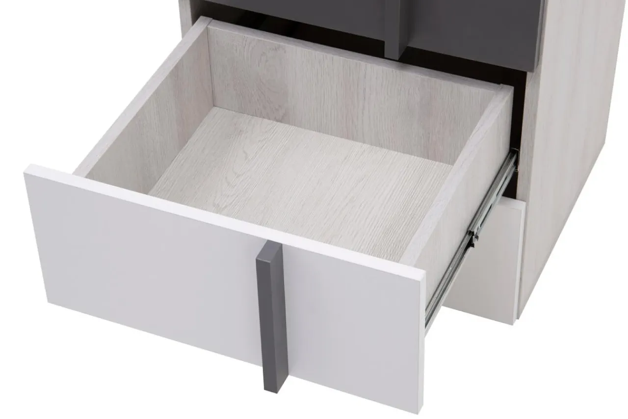 - Mebel pokryto laminatem białym, laminatem szarym i w kolorze białego dębu Wilson.
