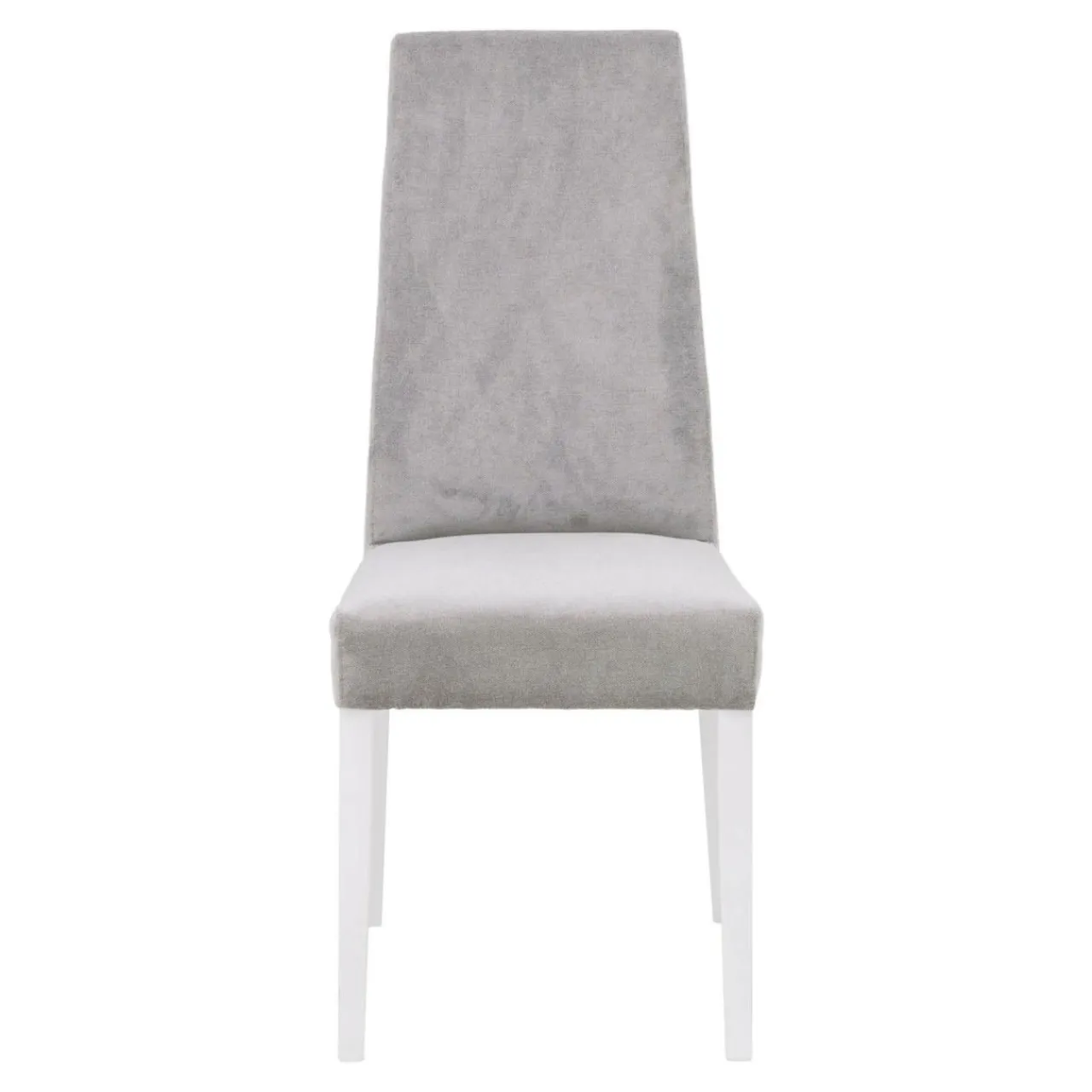 Krzesło wykończono matowym lakierem w białym kolorze. Szara tapicerka prezentuje się elegancko i podkreśla nowoczesny charakter wnętrza.