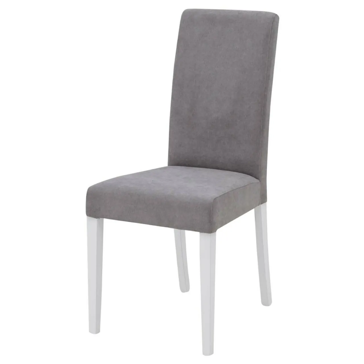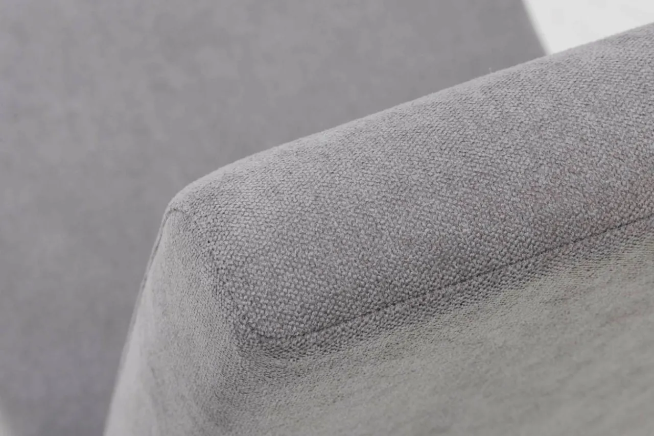 Biała barwa nóg mebla koresponduje z szarością tkaniny na siedzisku i oparciu.