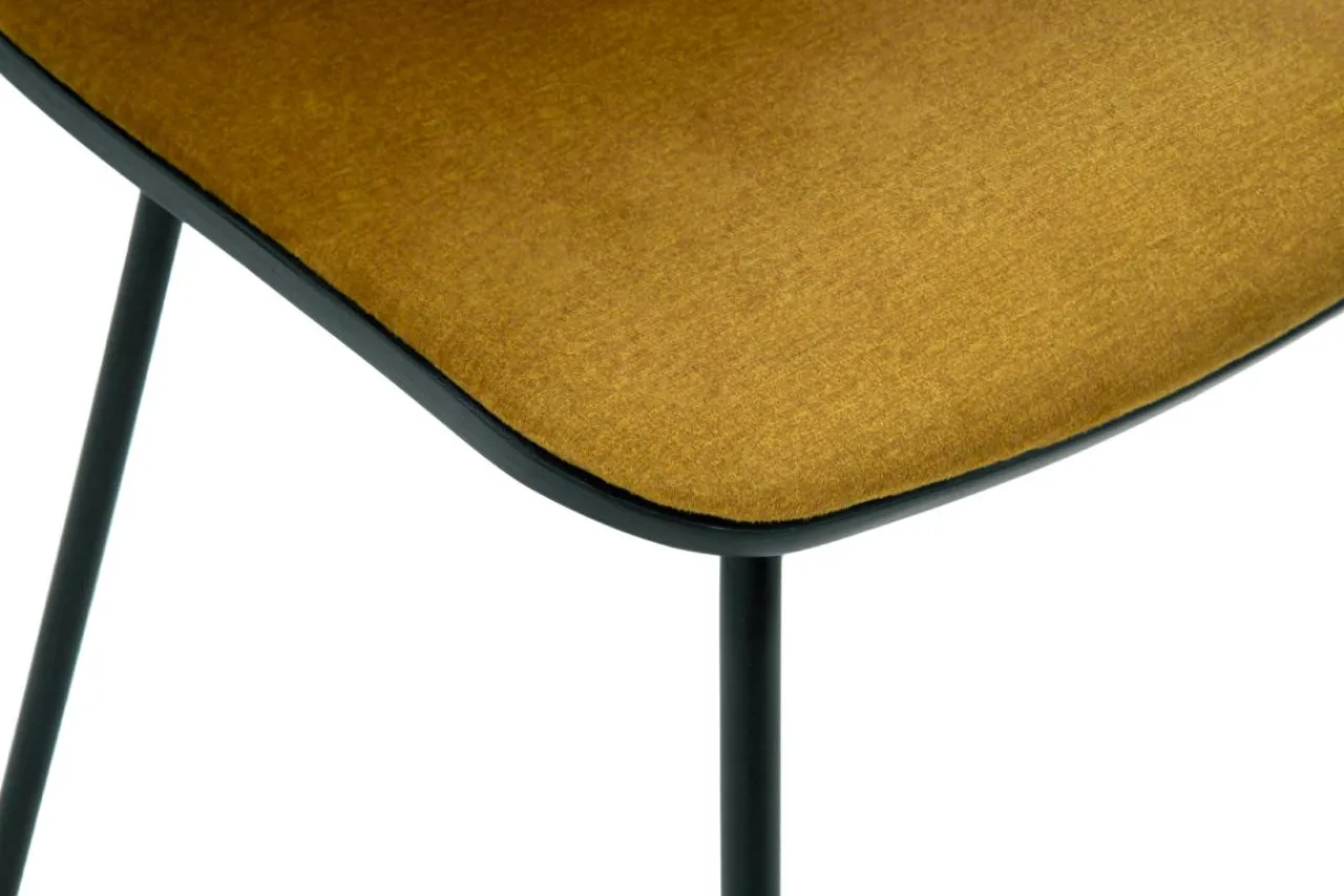 - Krzesło posiada miłą w dotyku welurową tapicerkę w kolorze musztardowym. Tkanina posiada efekt delikatnego połysku.