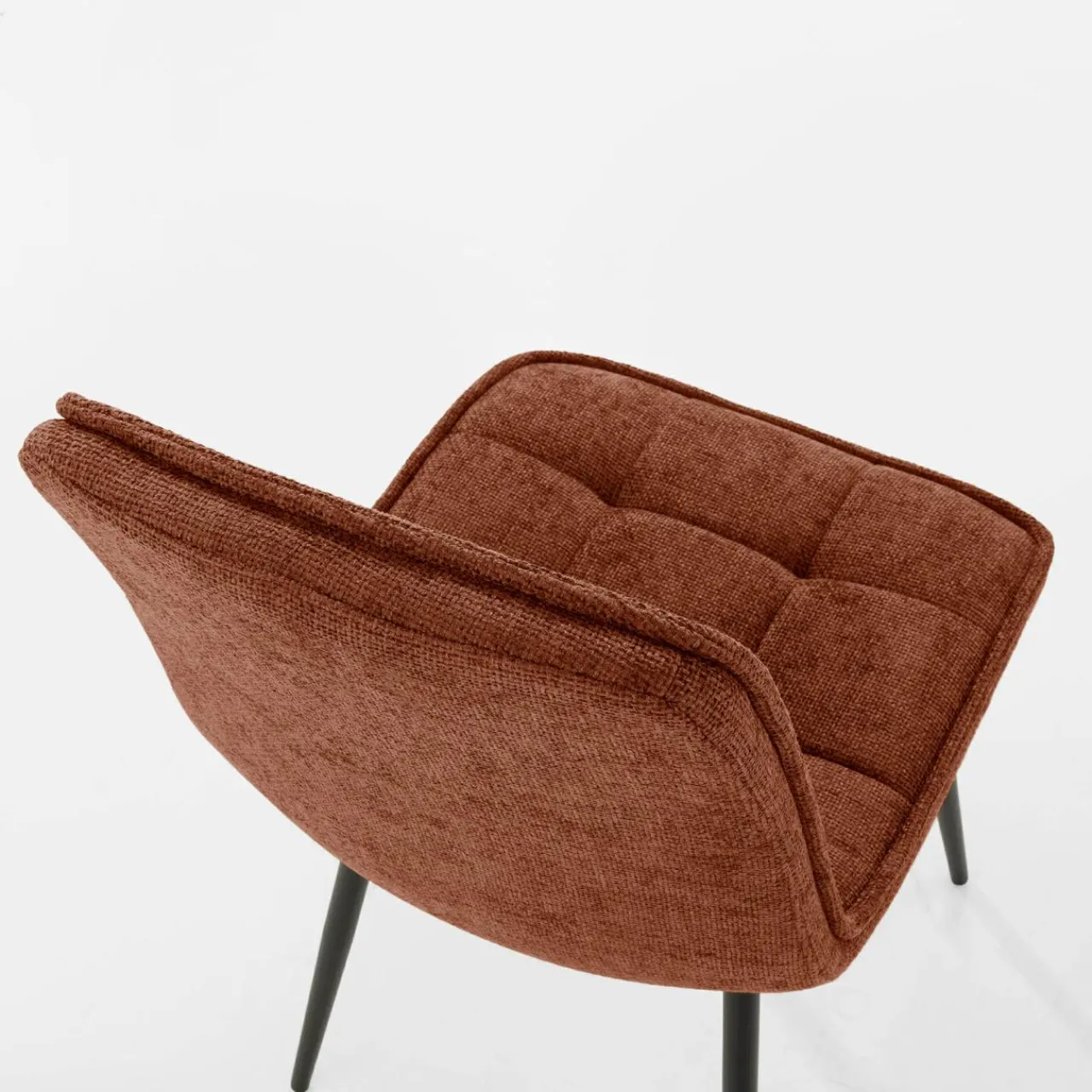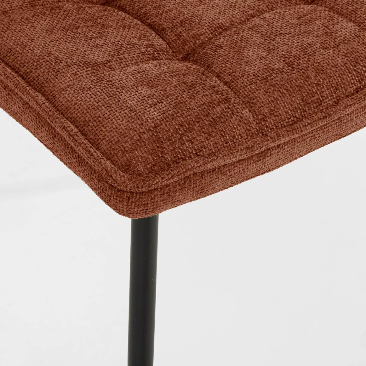 - Tapicerowane siedzisko – rudy materiał z pikowaniem świetnie komponuje się z drewnianymi stołami w ciemnych odcieniach oraz dodatkami w czerni lub mosiądzu.