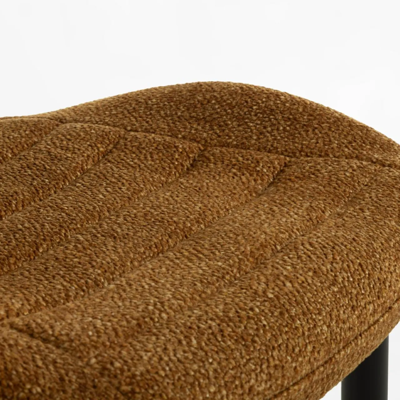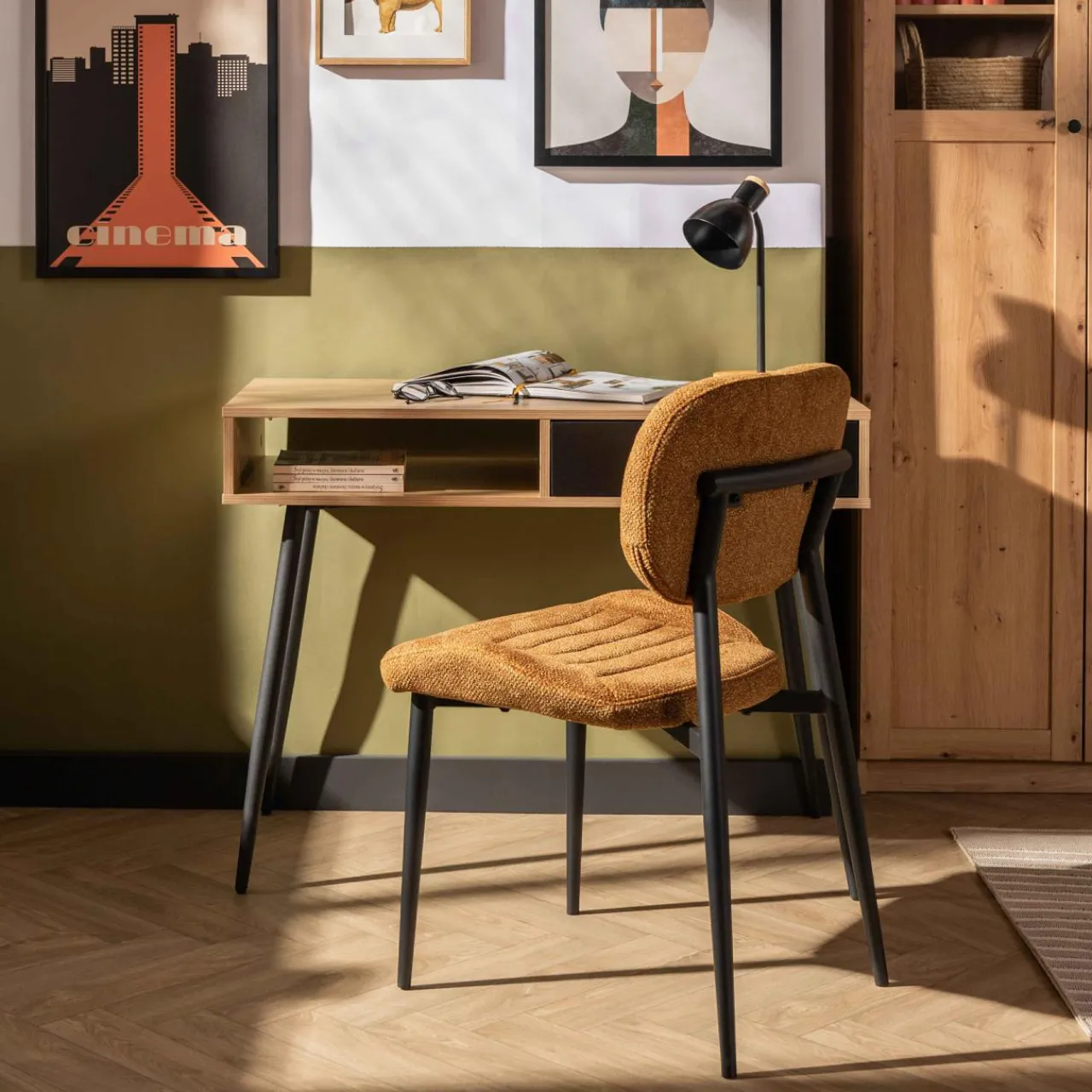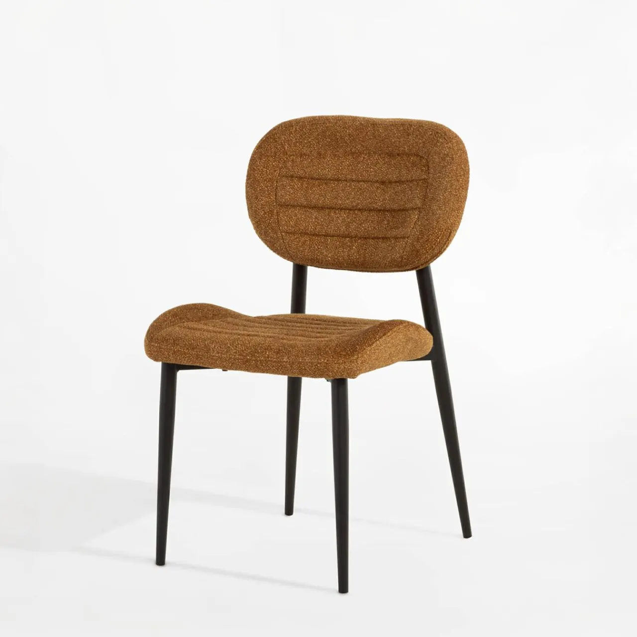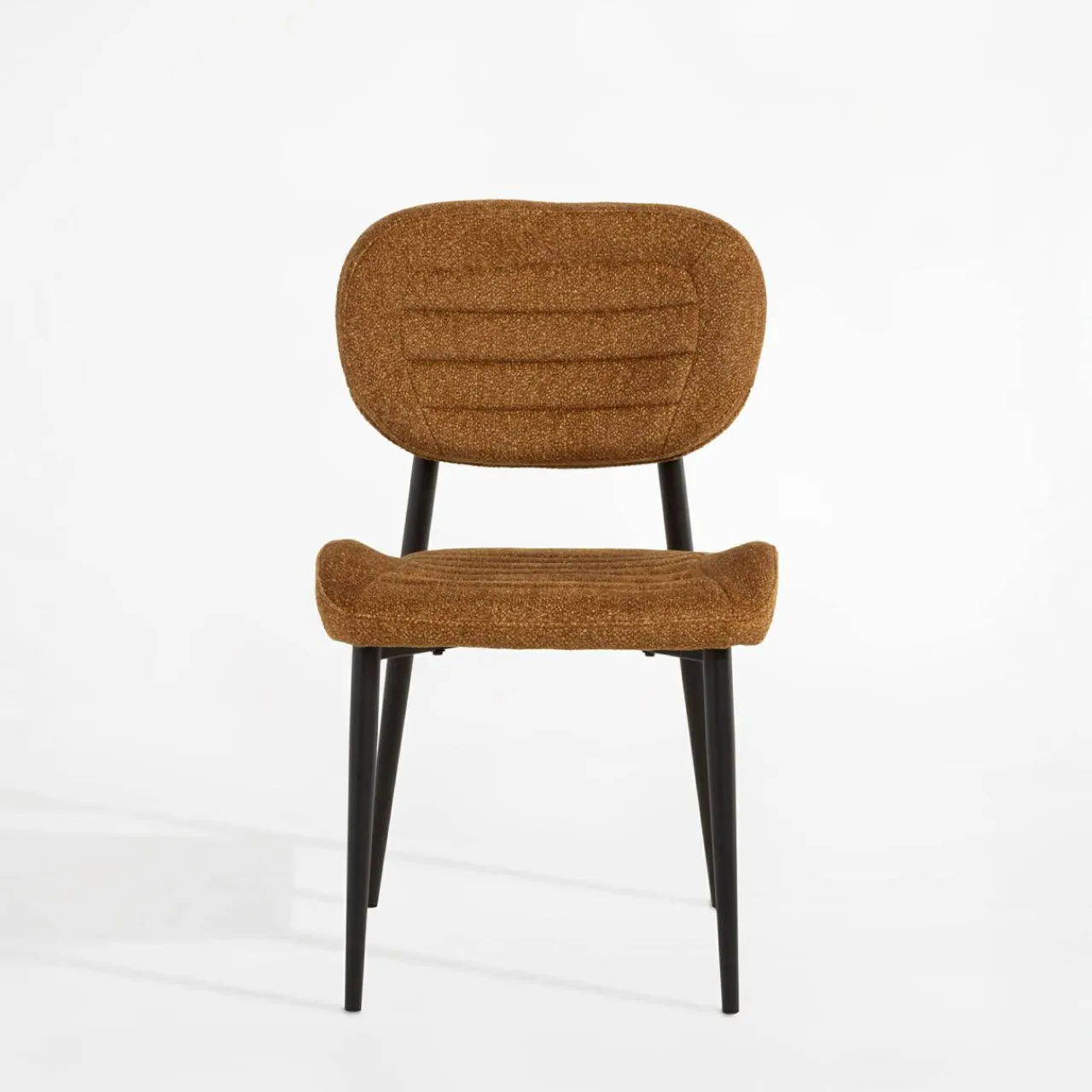 Tapicerka jest strukturalna, wyrazista w dotyku, przepleciona nitkami o kilku odcieniach żółci i beżu, dlatego krzesło FINESETT z pewnością wyróżni się w Twojej jadalni.