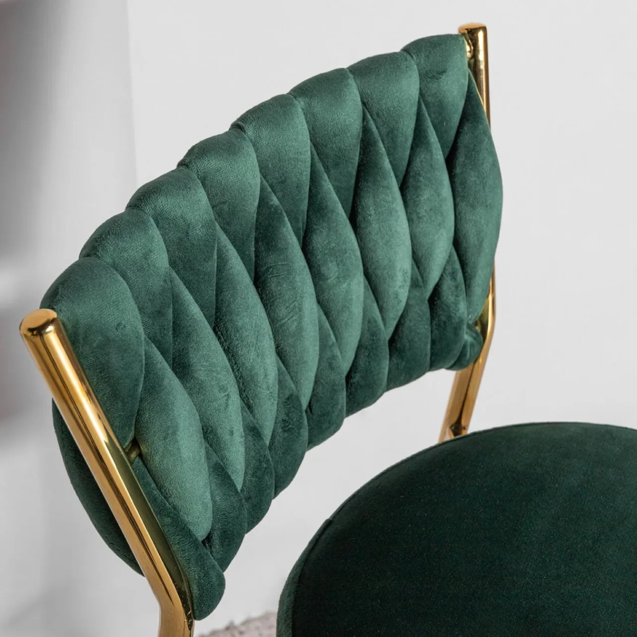 Ozdobna plecionka na oparciu będzie mocnym, ciekawym akcentem we wnętrzu. W połączeniu ze złotymi metalowymi nogami stworzy kompozycję, która będzie wizytówką Twojego domu.