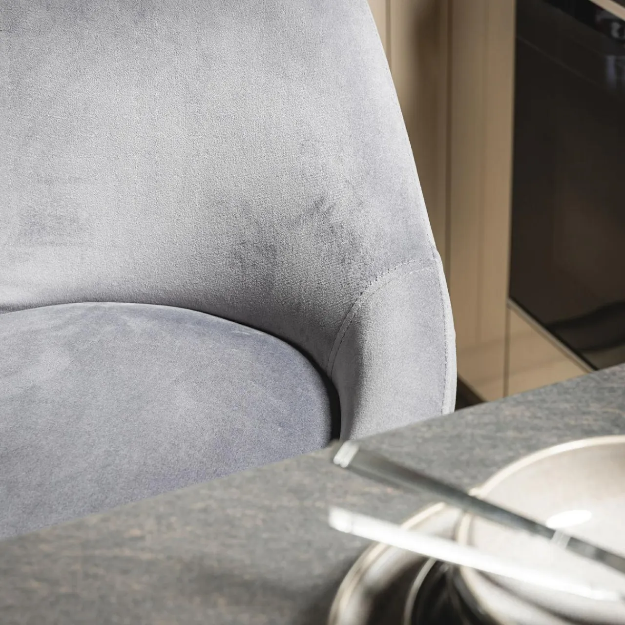 Szara tapicerka i czarna, matowa noga dopełnią każdą aranżację w stylu glamour. Sprawi, że industrialna kuchnia nabierze przytulnego charakteru.