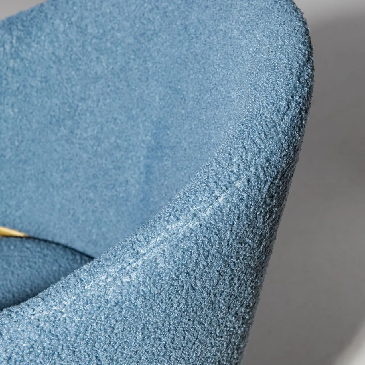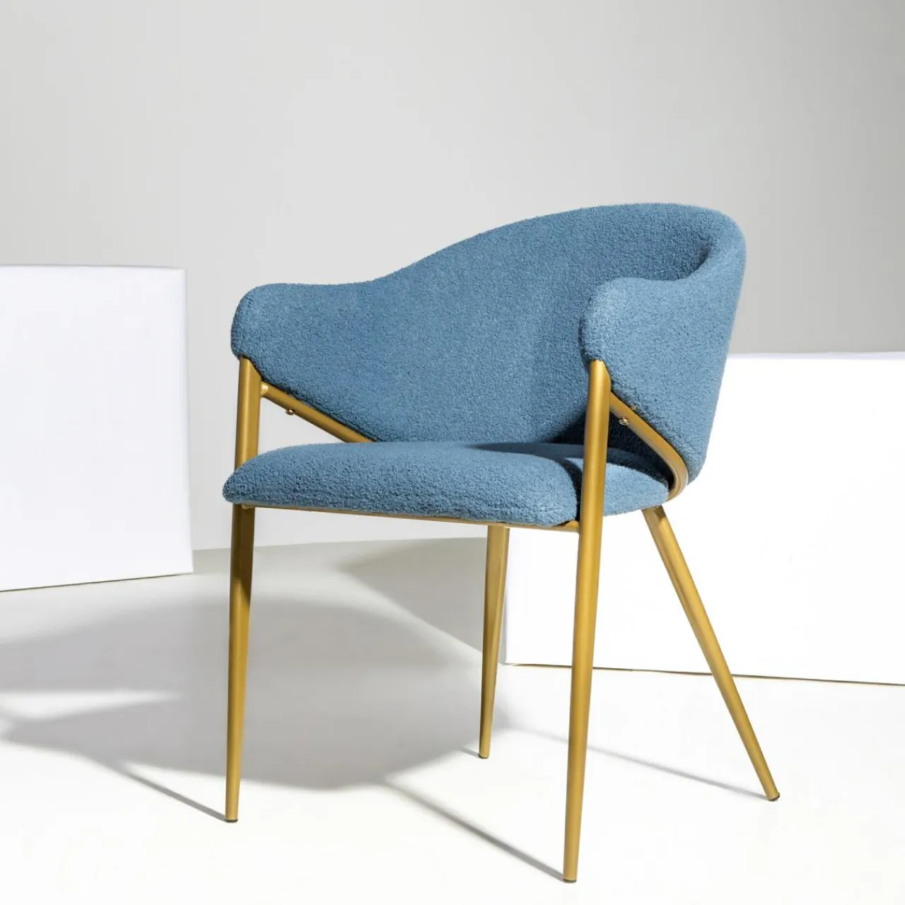 - Stalowy stelaż pomalowano na złoty kolor – współgra z niebieską tapicerką, tworząc elegancki duet.