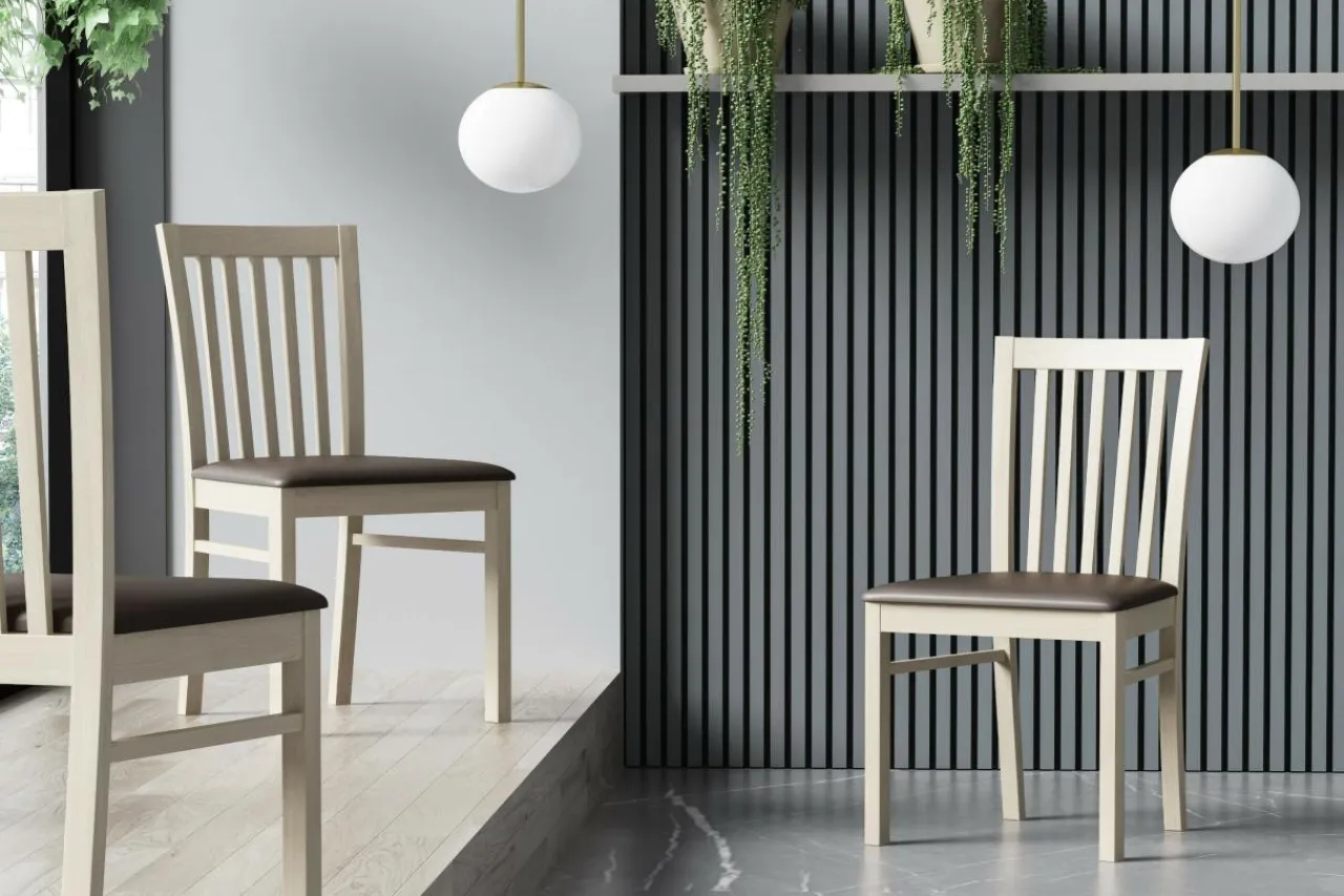 Swoim wyglądem prezentuje ponadczasowy styl, który można zastosować zarówno we wnętrzach o klasycznym oraz nowoczesnym charakterze. Swoim designem eksponuje naturalne piękno bukowego drewna o miodowej kolorystyce. Dobrane ze smakiem elementy tapicerowane w ciepłych odcieniach brązu dopełniają całości.