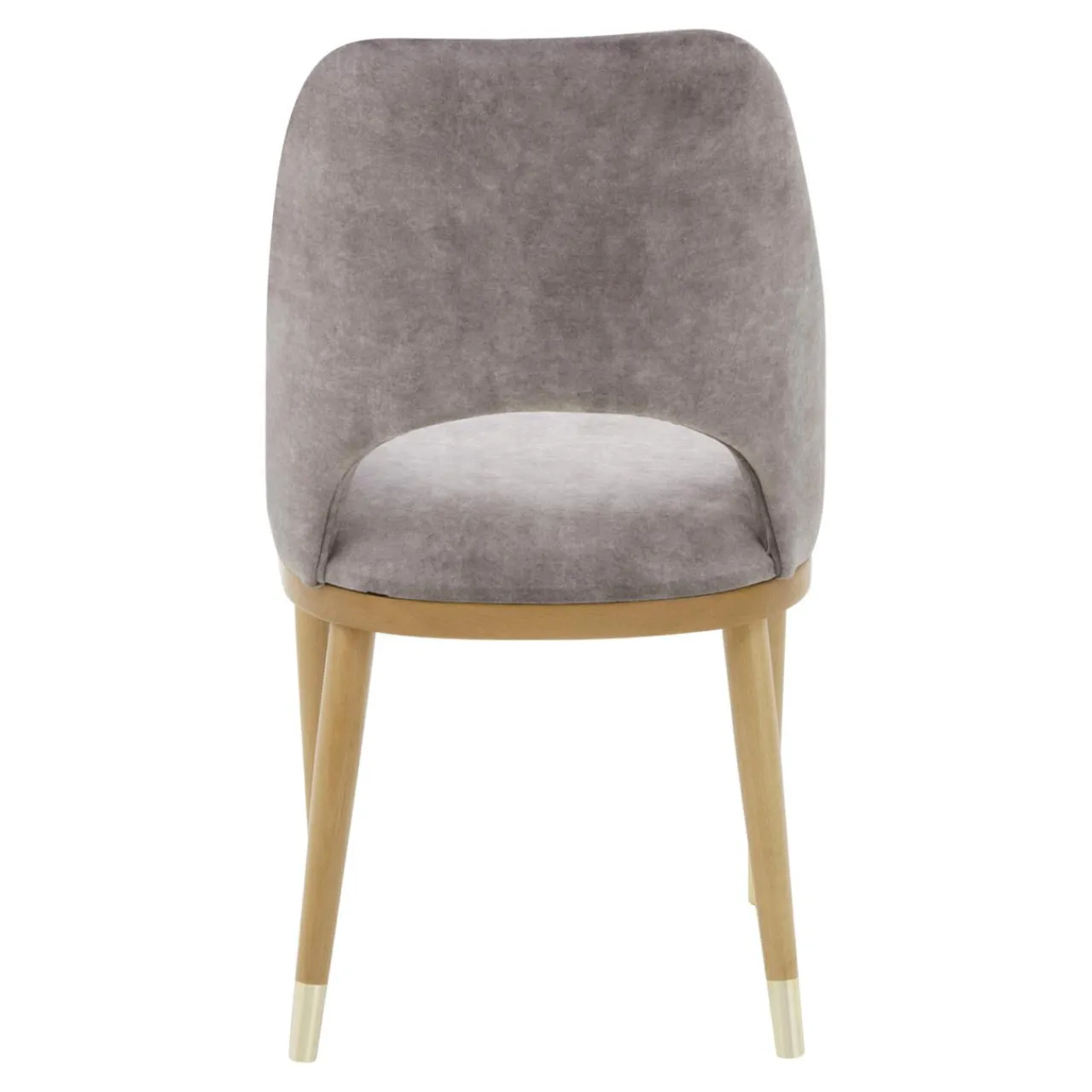 Krzesło YONAS zostało obite tkaniną w szarobeżowym odcieniu. Miękki welur podkreśla otulającą budowę mebla.