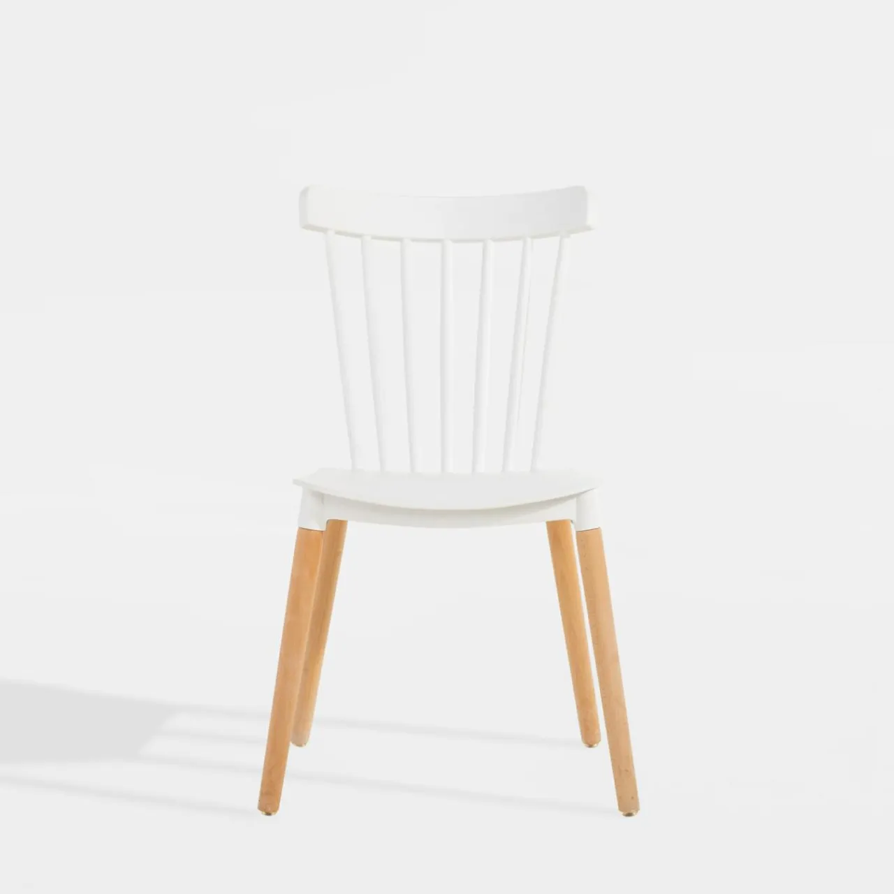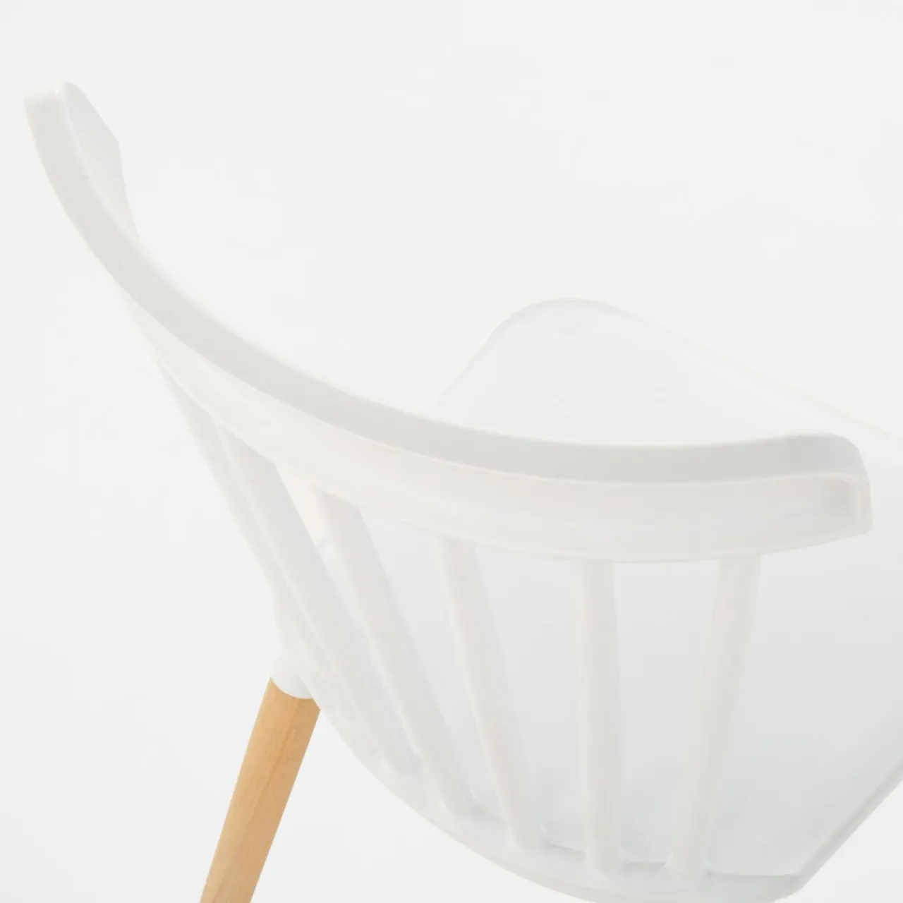 - Drewniane nogi w naturalnym odcieniu drewna łączą się z wykonanymi z tworzywa siedziskiem oraz oparciem, które wybarwiono na biało. Całość prezentuje się ciekawie i nowocześnie.