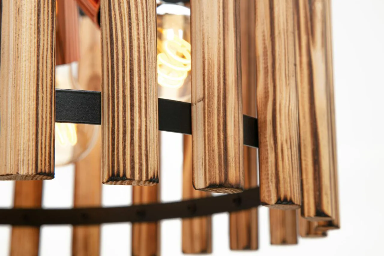 - Metalowy stelaż został ozdobiony pionowo osadzonymi drewnianymi listewkami, które osłaniają znajdujące się wewnątrz żarówki.