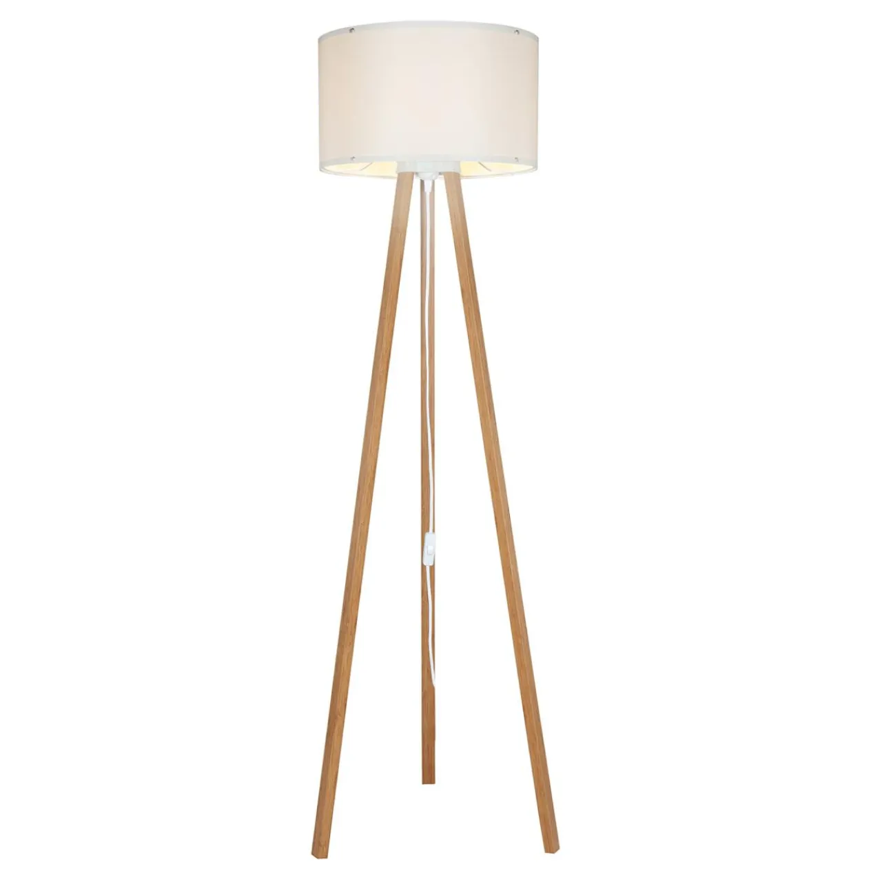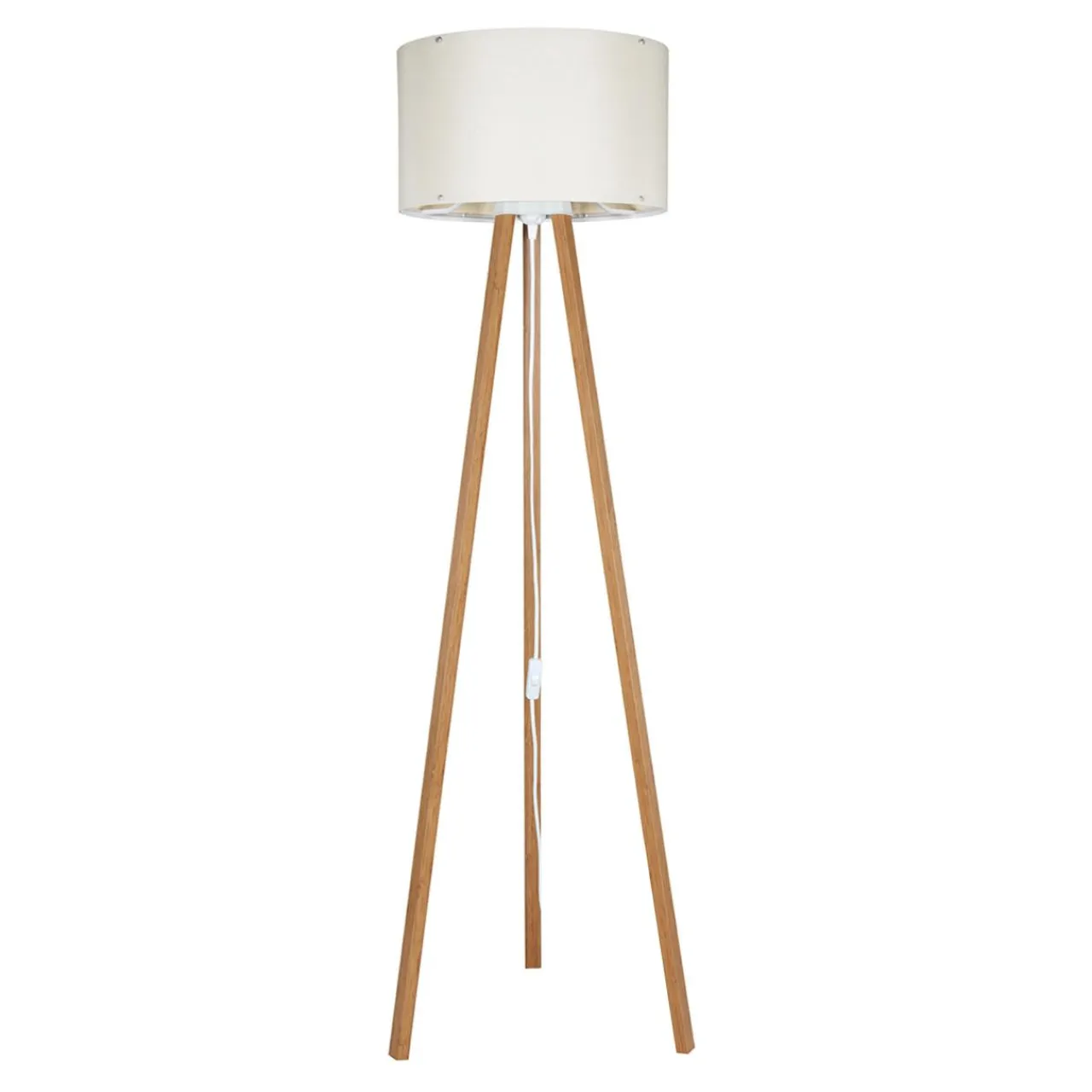 Lampa podłogowa PIKO została zwieńczona abażurem o nowoczesnym kształcie walca. Jego kremowy kolor dopełnia podstawy z jasnego drewna.