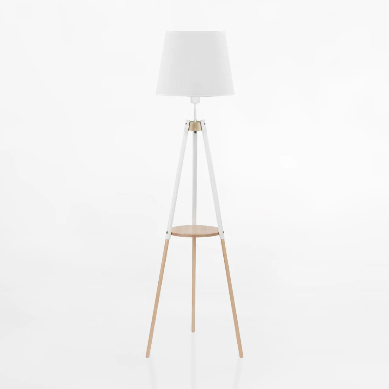 Lampa została zwieńczona abażurem o tradycyjnym, trapezowym kształcie. Jego biały kolor dopełnia podstawy z jasnego drewna.
