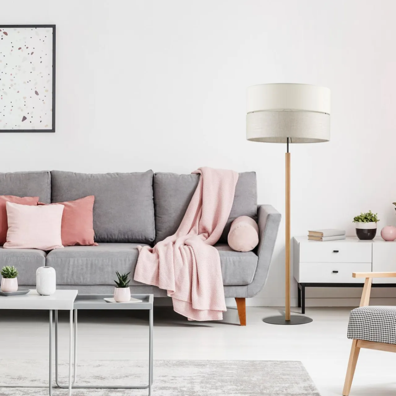- Stonowany kolor i wyrazista faktura tkaniny abażuru będą idealnie pasowały do palety jasnych beżów, bieli i szarości.