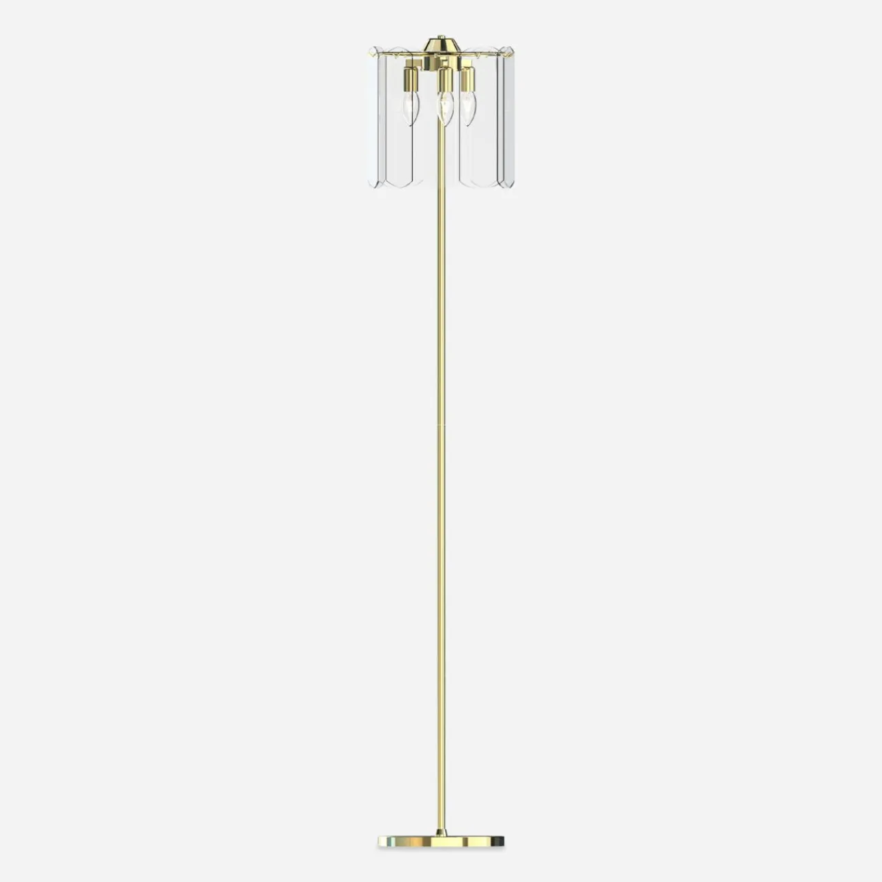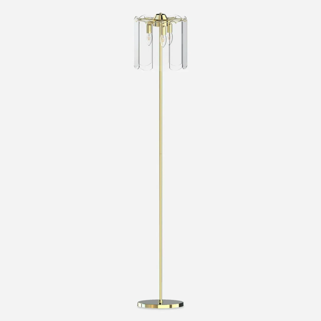 - Modny kształt lampy oparty jest ozdobach o regularnym kształcie, wykonanych z transparentnego szkła. Wykończenie lampy łączy złoty odcień oprawy ze szklanym kloszem, wewnątrz którego doskonale widać kształty 3 żarówek.
