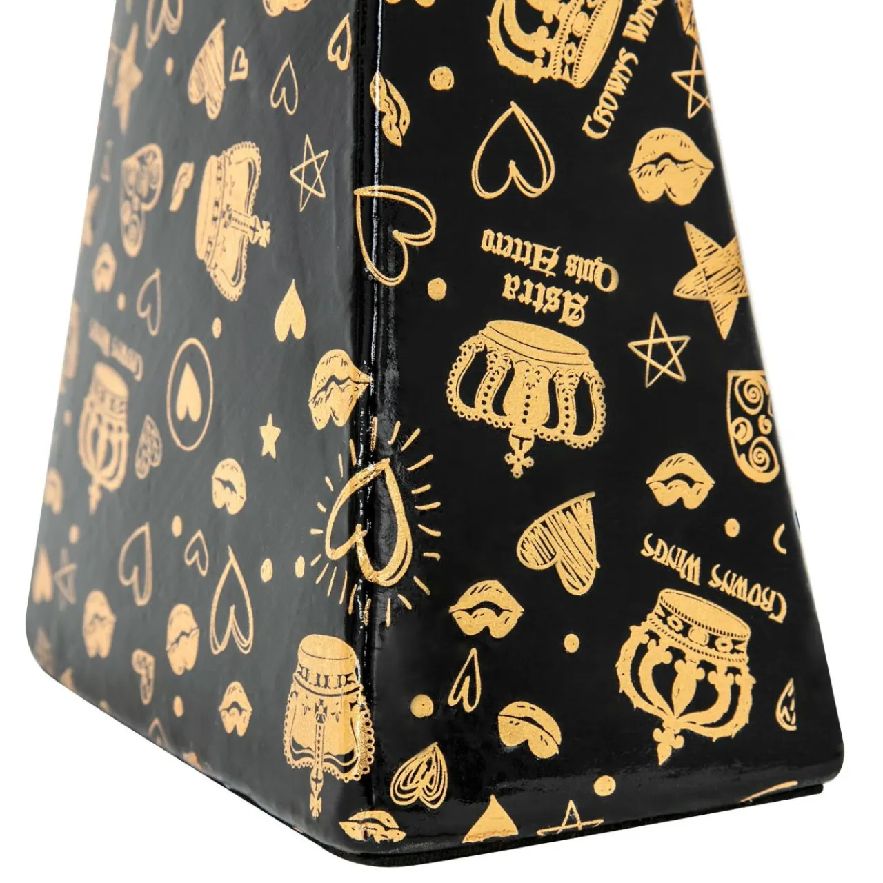 Czworokątna podstawa lampy, lekko zwężająca się ku górze została ozdobiona złotymi grawerunkami, które przedstawiają serca i korony. W znaczący sposób urozmaicają wystrój, dodając nowoczesnego pierwiastka.