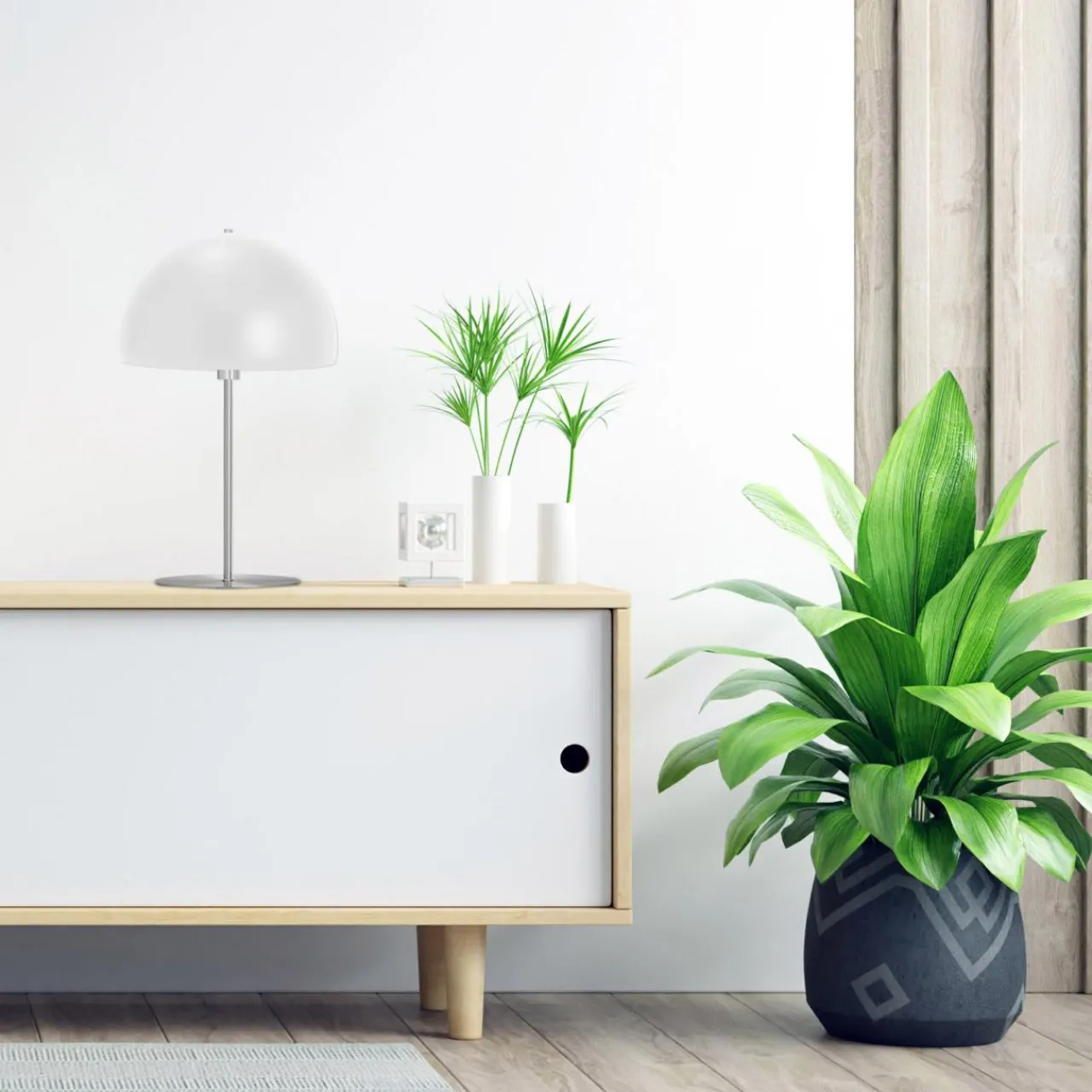 - Na osobną uwagę zasługuje klosz o charakterystycznej budowie kopuły w białym kolorze. W naturalny sposób wieńczy lampę oraz stanowi neutralne tło dla ozdób i dodatków aranżacyjnych.