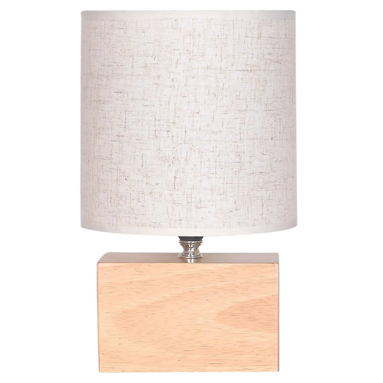 - Abażur ma nowoczesny kształt, opinająca go tkanina jest brązowa.