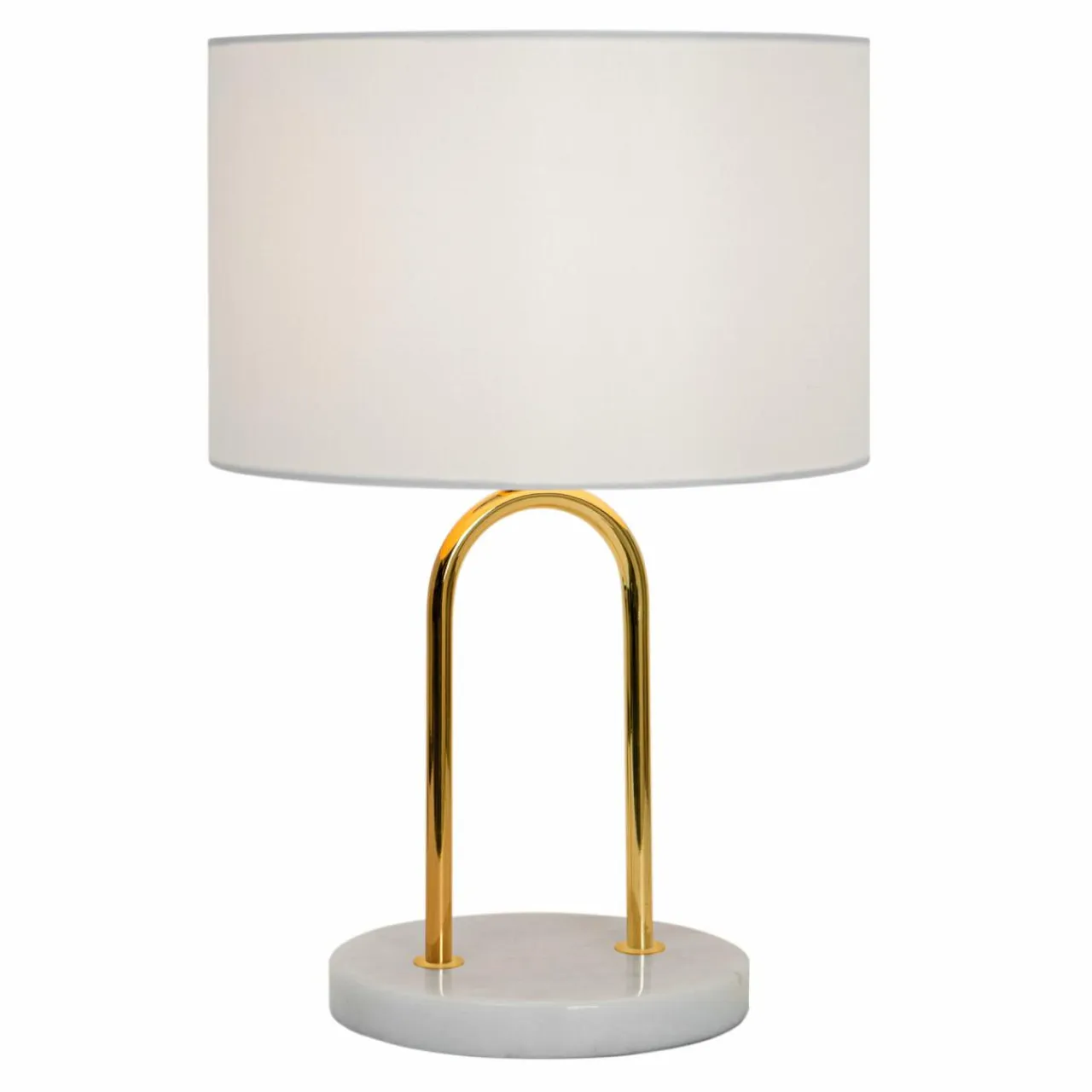 Jej okrągła podstawa w kolorze marmuru przyjemnie koresponduje z nóżką w złotym połysku oraz białym, materiałowym abażurem.