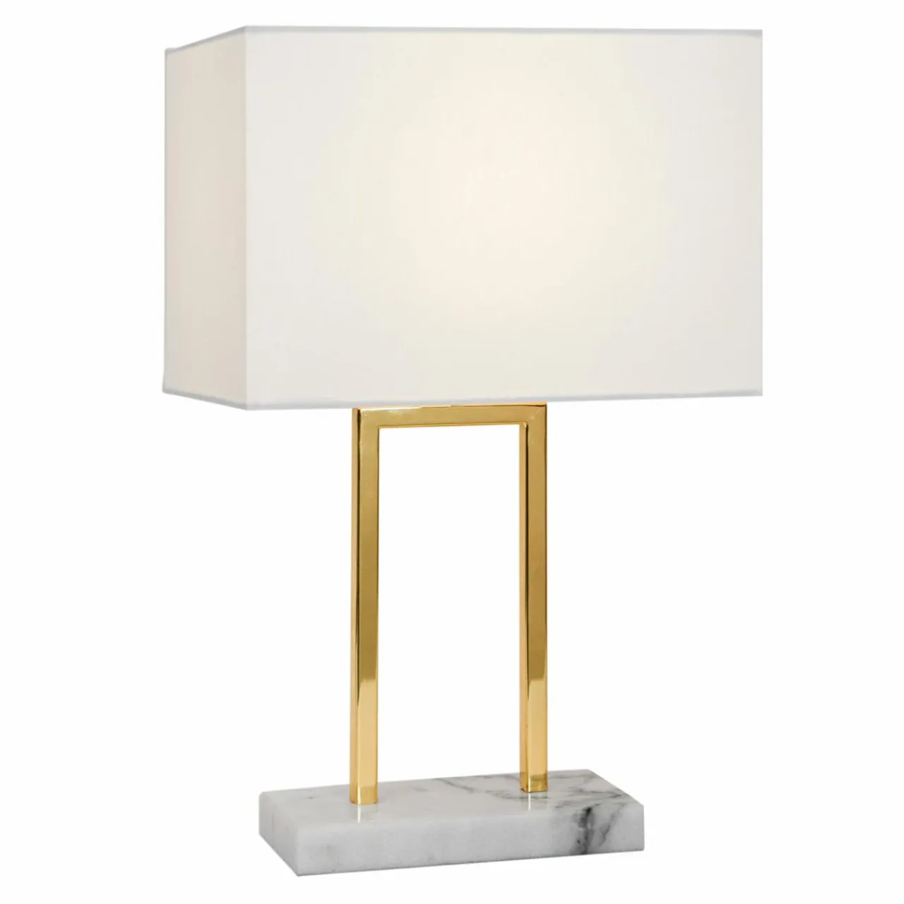 Jej prostokątna podstawa w kolorze marmuru przyjemnie koresponduje z nóżką w złotym połysku oraz białym, materiałowym abażurem.
