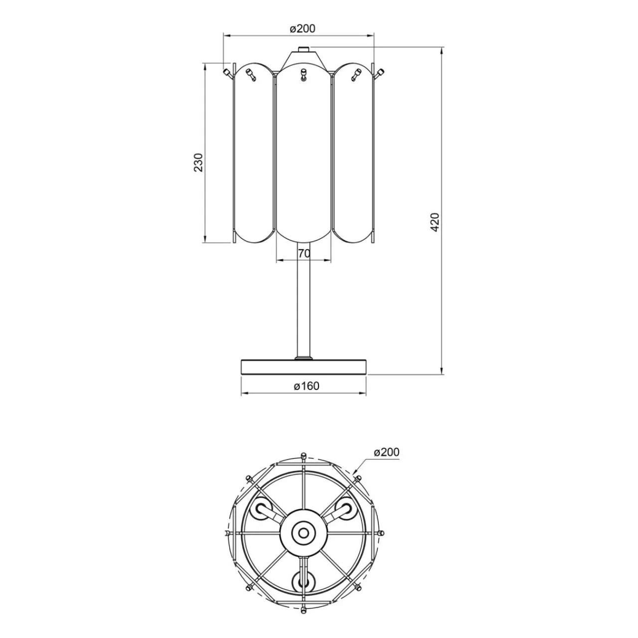 - Lampa posiada okrągłą podstawę i złoty stelaż. Jej średnica to 20 cm. Doskonale uzupełni oświetlenie salonu, sypialni lub gabinetu.