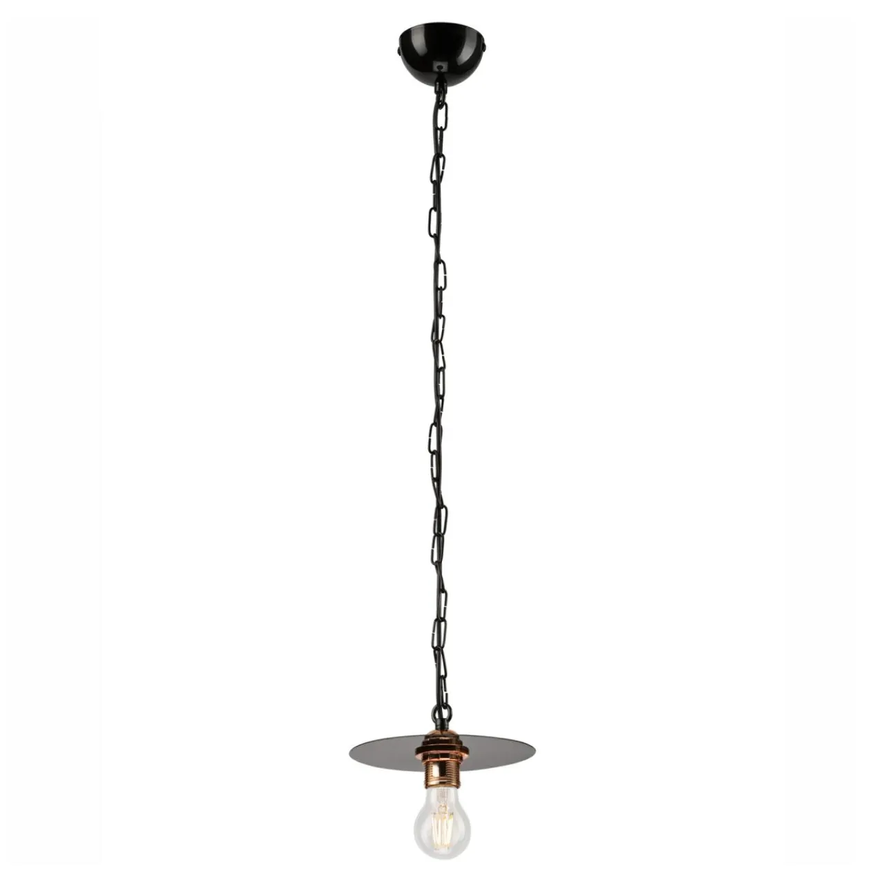 Czarne wykończenie lampy lekko błyszczy w świetle, a jednolity kolor bazy i ozdobnego łańcucha podkreśla metaliczny odcień miedzi przy oprawie żarówki.