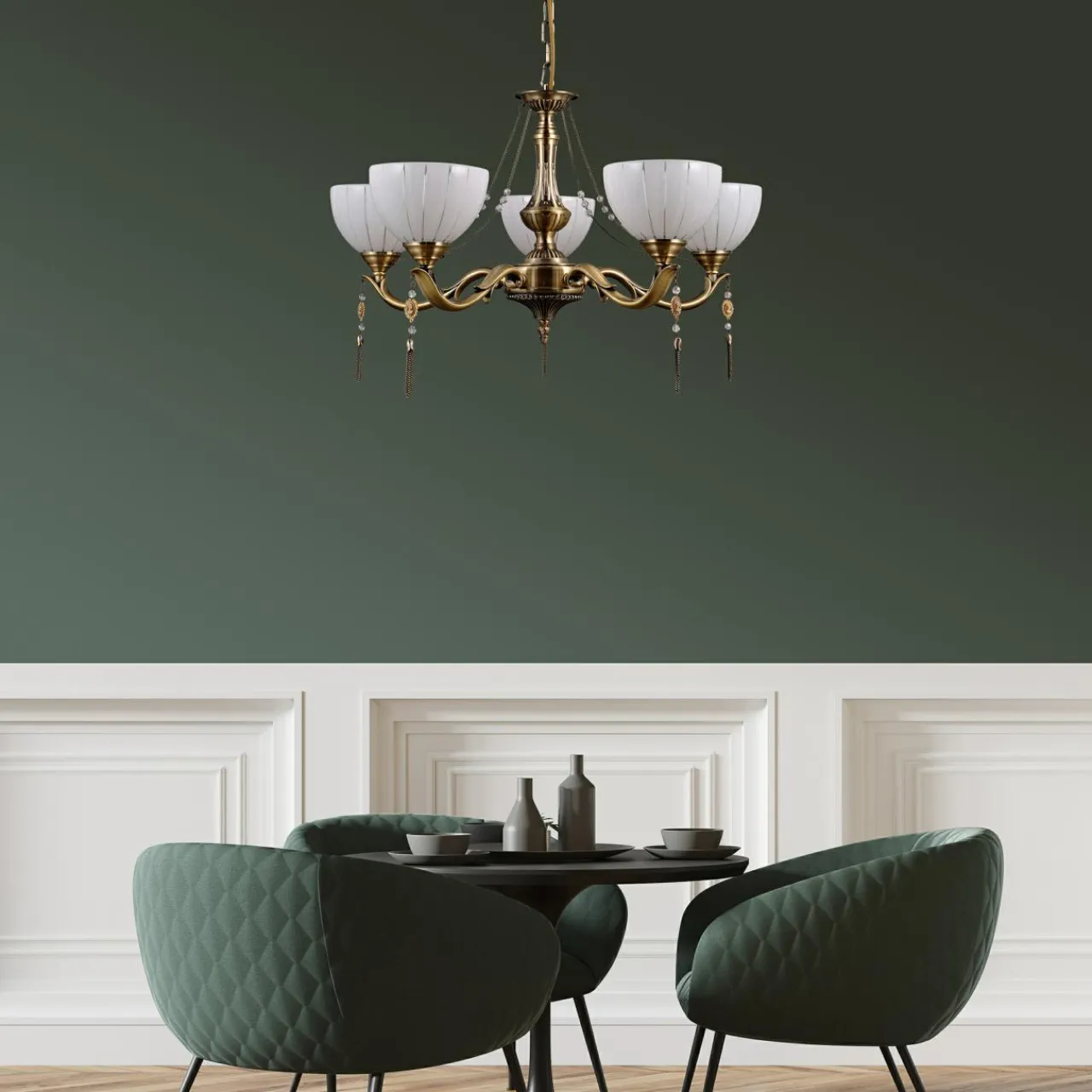 W skład kolekcji wchodzą 2 modele wiszące oraz kinkiet. Lampy posiadają mlecznobiałe klosze o kształcie kielicha oraz zdobioną podstawę i ramiona w odcieniu złota.