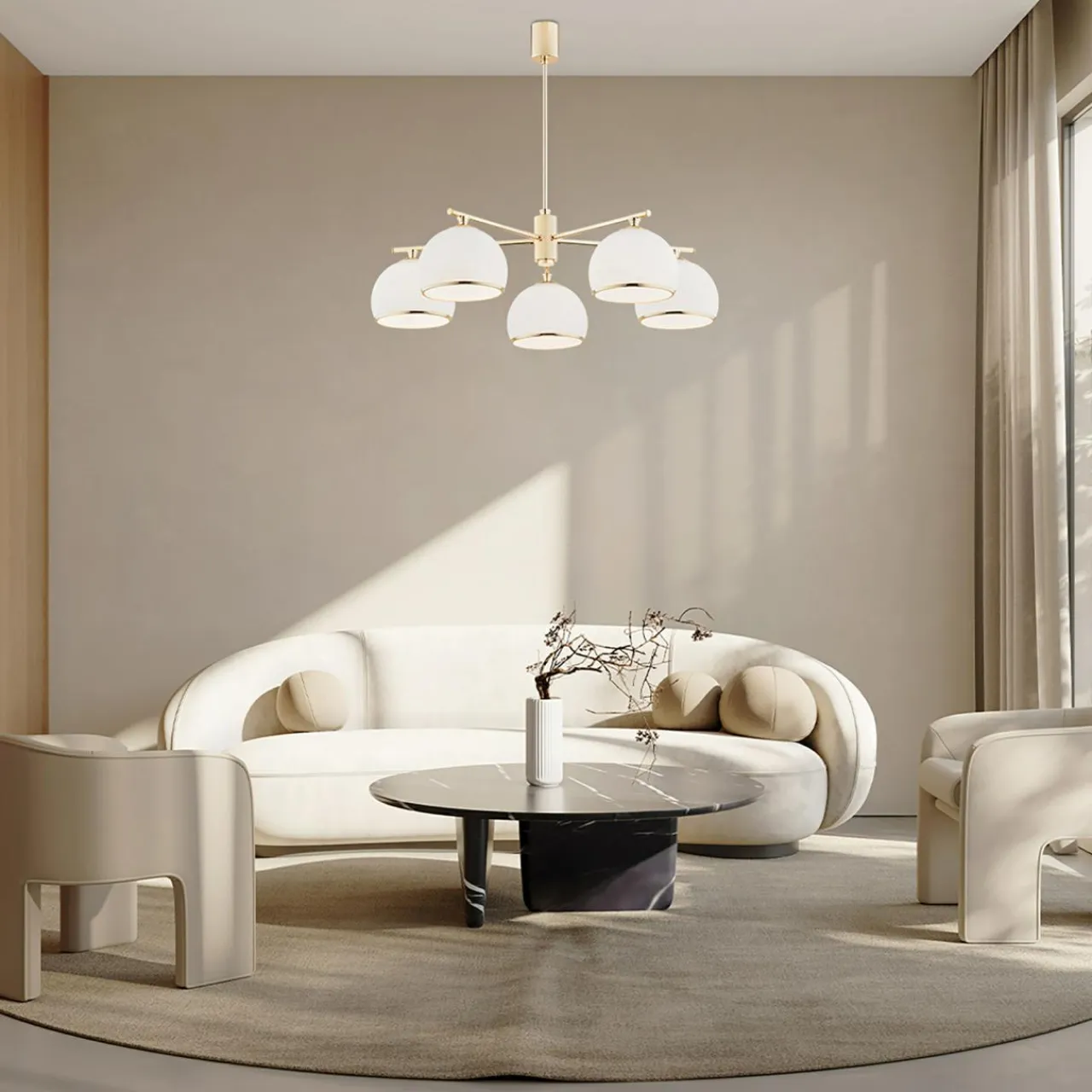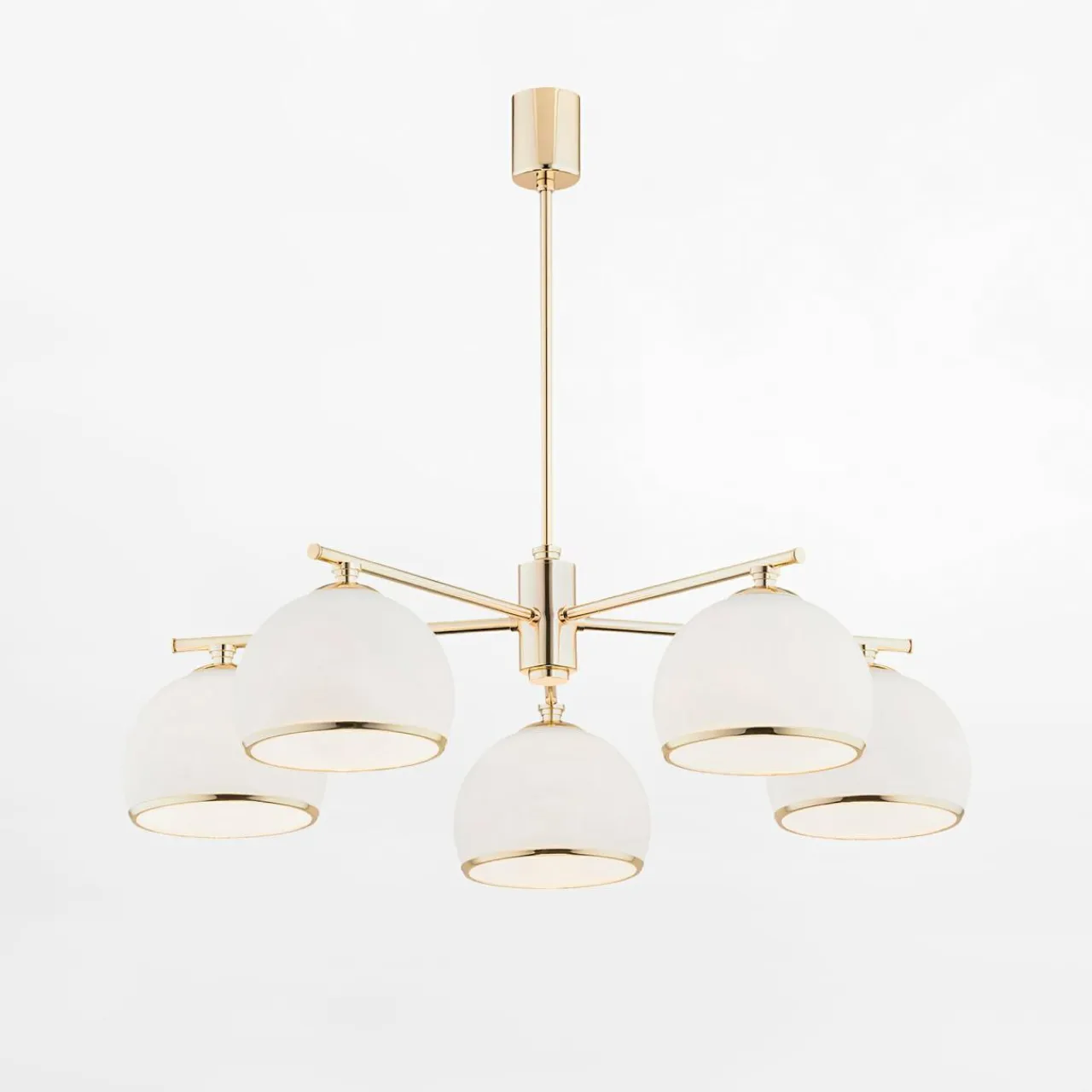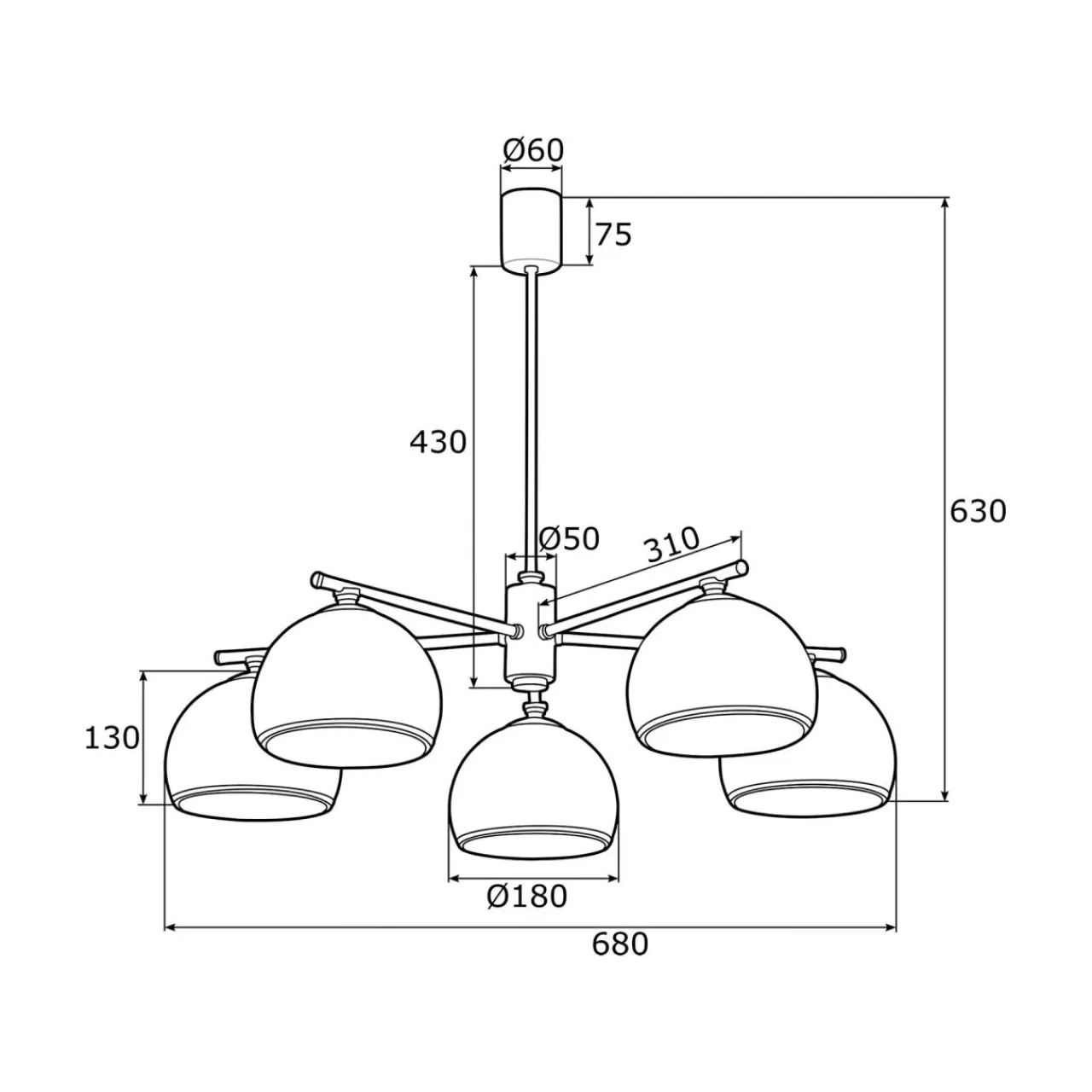 Jego design sprawia, że idealnie sprawdza się jako oświetlenie dla dużych, przestronnych wnętrz. Zwieńczenie w postaci 5 kloszy koncentrycznie ustawionych kloszy tworzy średnicę 68 cm.