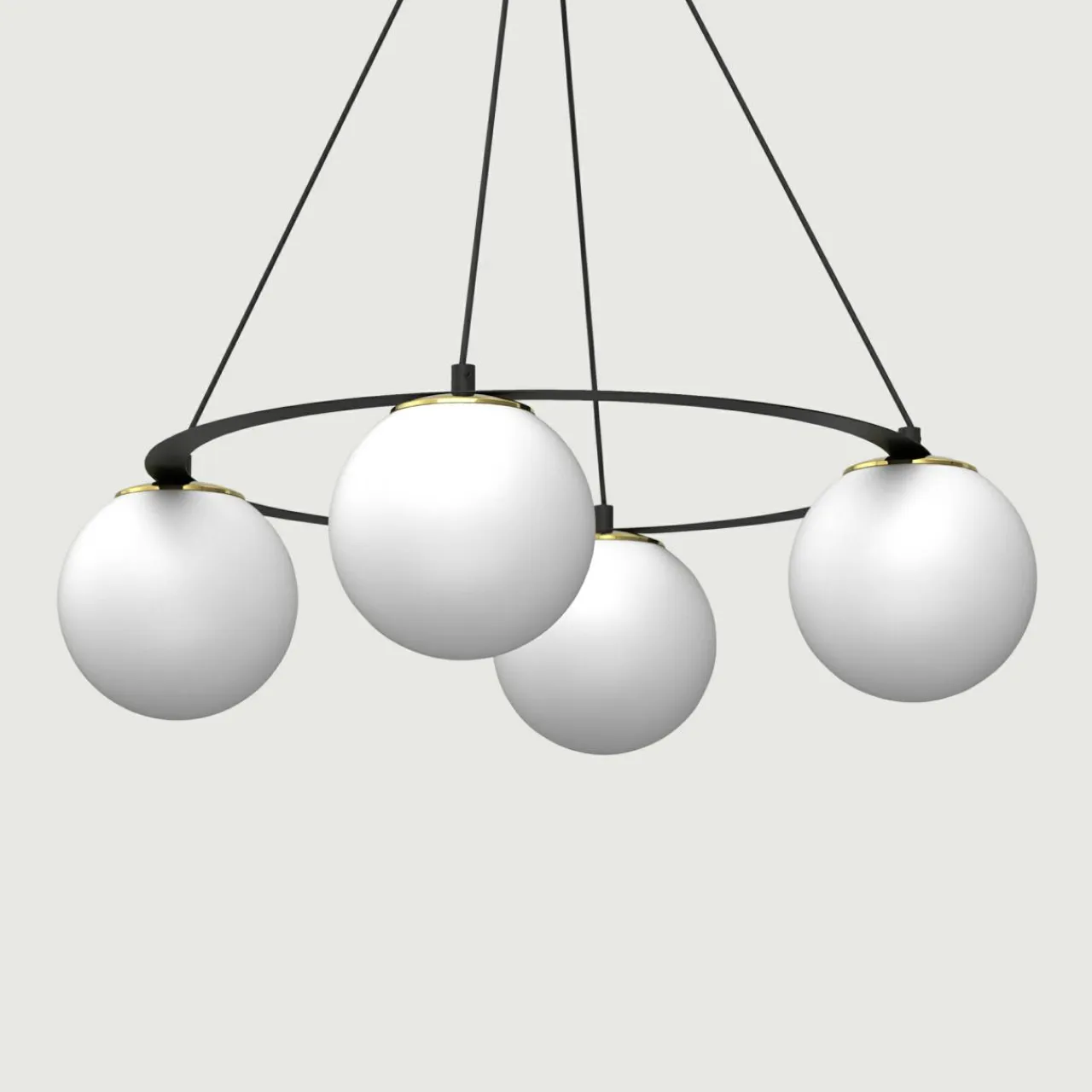 - Zestawienie czarnej oprawy z białymi kulami kloszy idealnie wpisuje się w przestrzeń salonu lub jadalni.