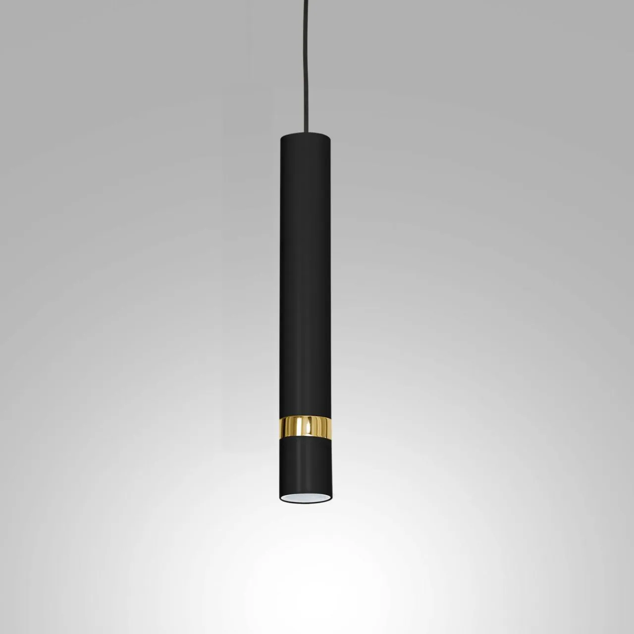 - Obudowa lampy w kształcie skierowanego pionowo w dół walca została wykonana z lakierowanego metalu. Cechą charakterystyczną jest pierścień w kolorze złota w dolnej części lampy.