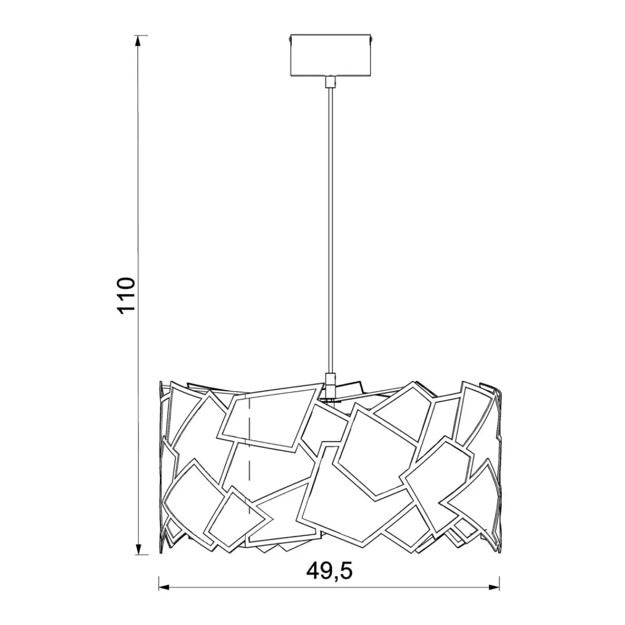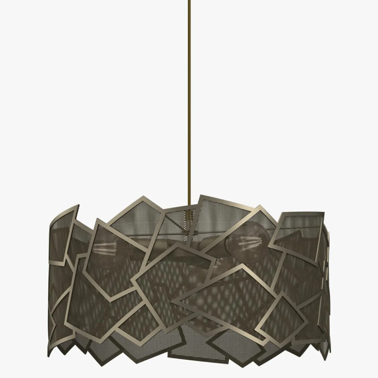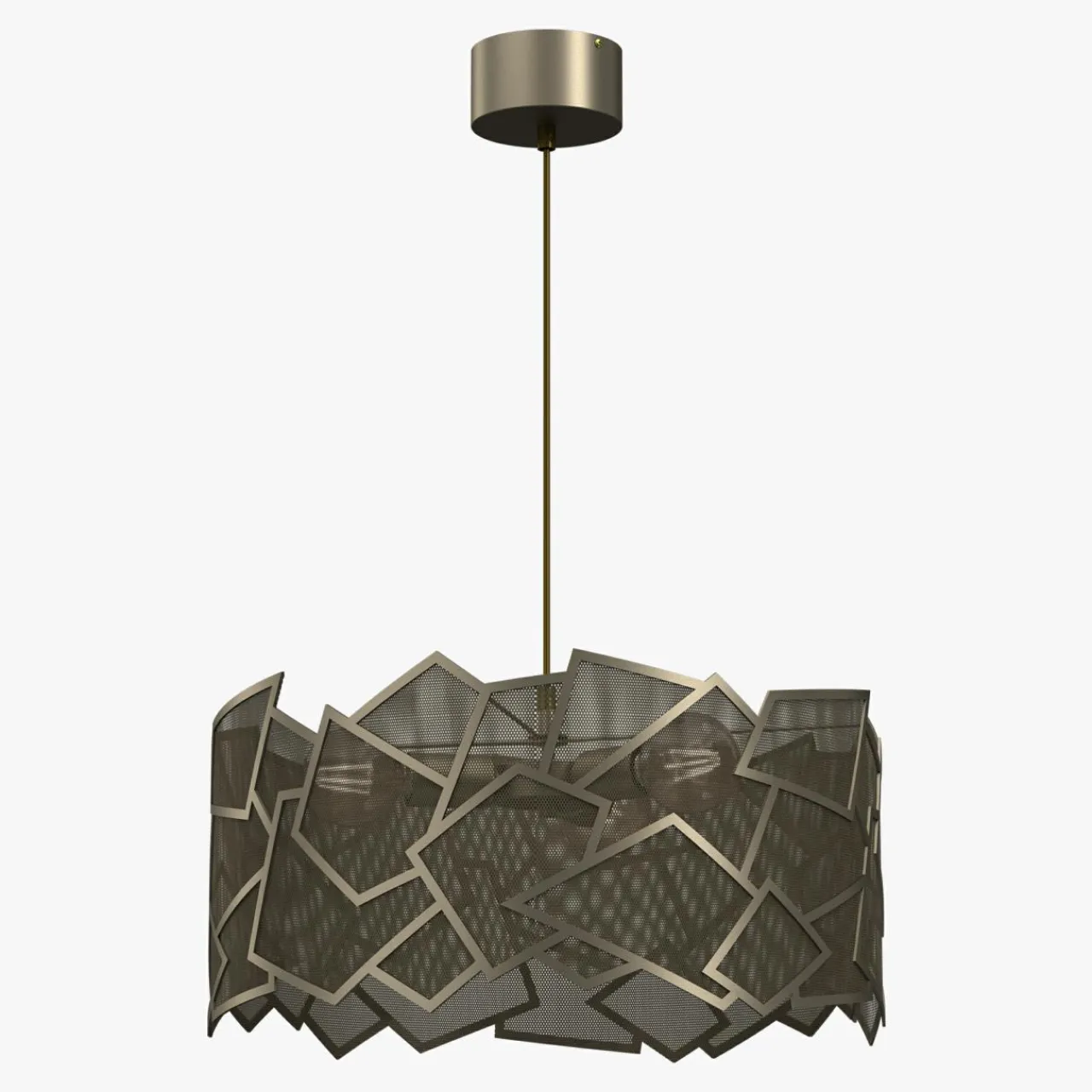 - Metalowy abażur wiszącej lampy CAMO zwraca uwagę ciekawym wzorem – siateczka w czarnym kolorze wpisana w ostro zakończone geometryczne figury. Nachodzące na siebie kształty dyskretnie przysłaniają żarówki.
