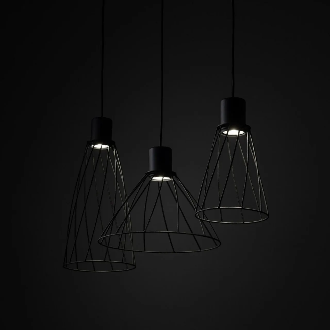 Model wiszący lampy z 3 kloszami (każdy o innym kształcie) i oprawą dla 3 żarówek GU10 wykorzystasz w dużych, reprezentacyjnych pomieszczeniach.