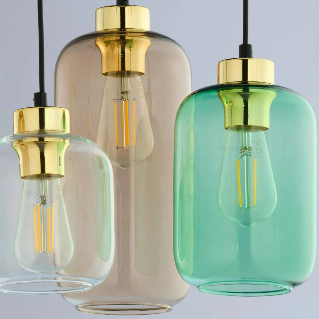 Jej 3 transparentne klosze o różnorodnym kształcie i odcieniu szkła (przeźroczysty, brązowy i zielony) upiększają wizualnie wnętrze i dodają mu dyskretnej elegancji. Podsufitka lampy jest okrągła, czarna, w matowym odcieniu. Przy mocowaniu kloszy widoczne jest złote wykończenie.