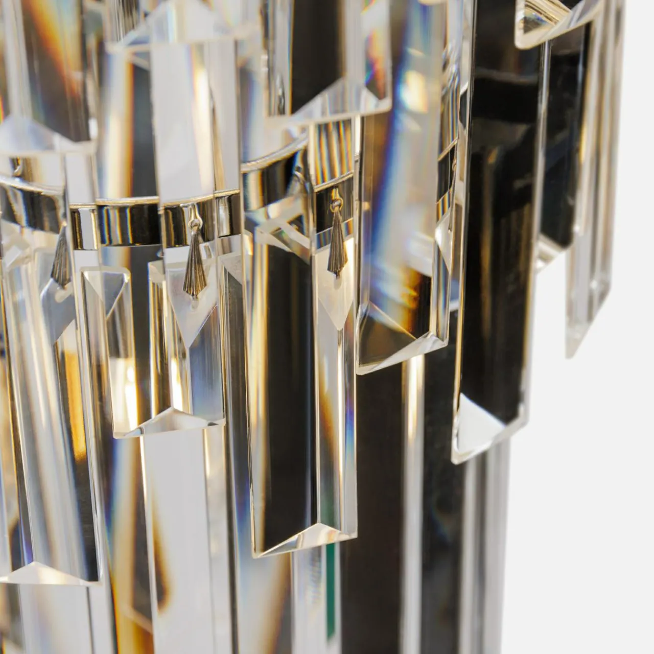 - Szklane kryształki zawieszone na metalowej podstawie uformowane są w okręgach na wzór kaskady – od największego koła do najmniejszego.
