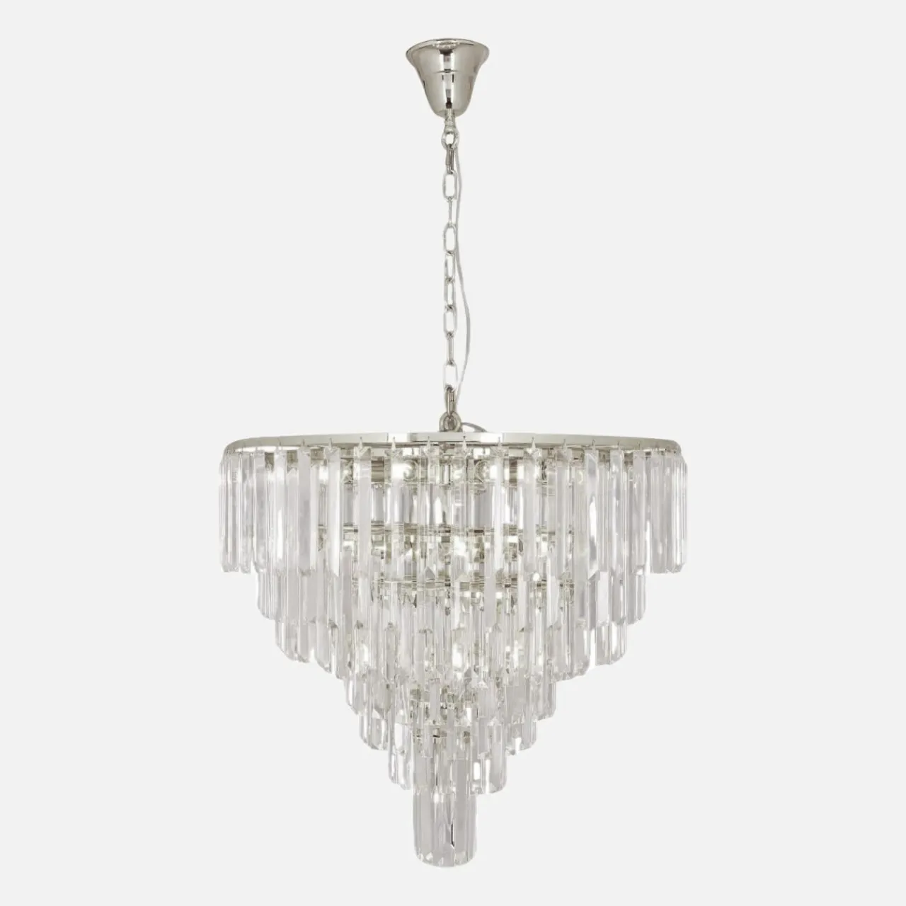 - Warstwy szklanych ozdób zawieszonych na stelażu zostało ułożonych na wzór kaskady – od największego koła do najmniejszego. Lampa posiada 7 warstw tych dekoracji.
