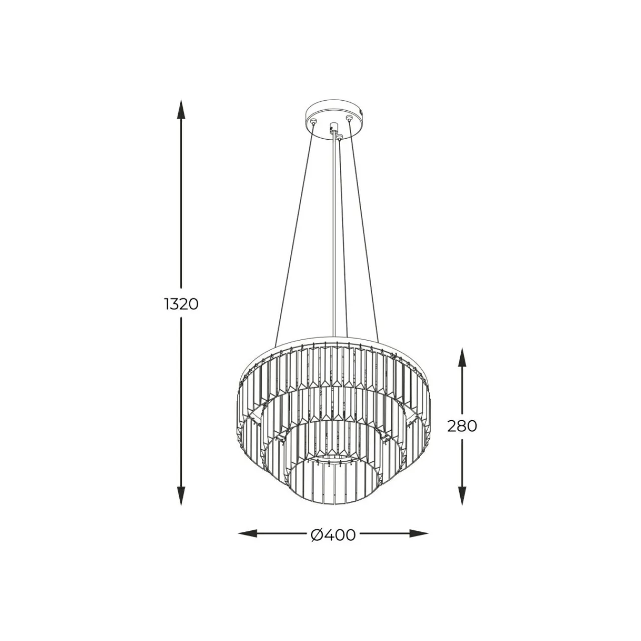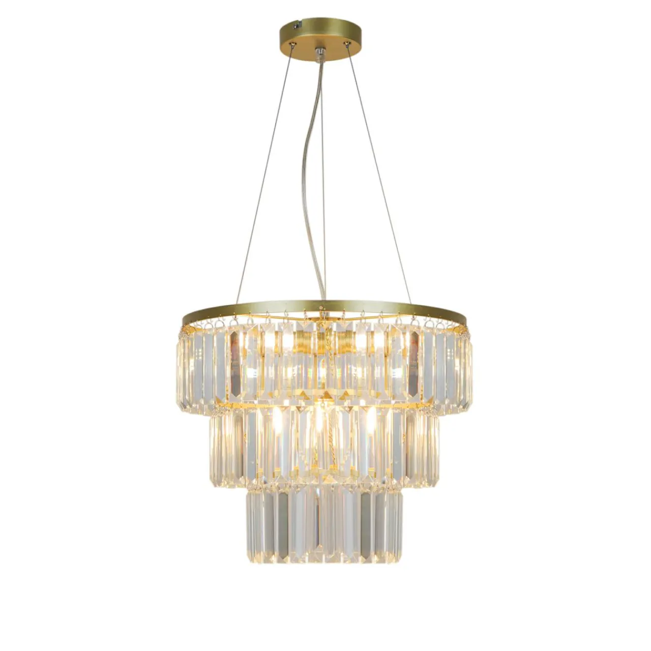 - Osłonę żarówek stanowią szklane elementy w formie kryształów, zawieszone kaskadowo w 3 rzędach. Ich obecność sprawia, że lampa doskonale współpracuje ze światłem sztucznym i naturalnym.