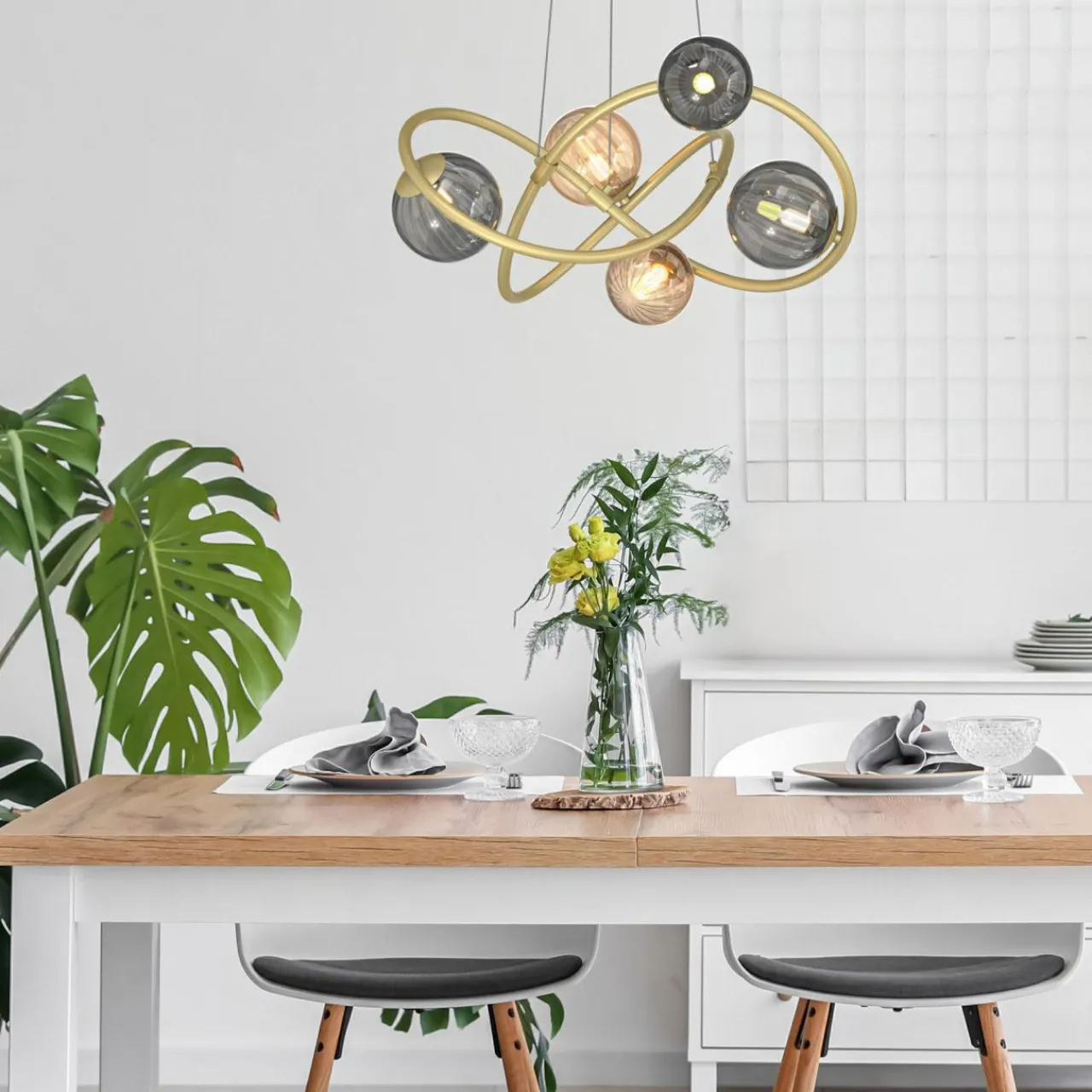 Wyróżnia ją eleganckie, połyskujące wykończenie w złotym kolorze, jednak to dobór odcienia szkła w kulistych kloszach zwraca największą uwagę.