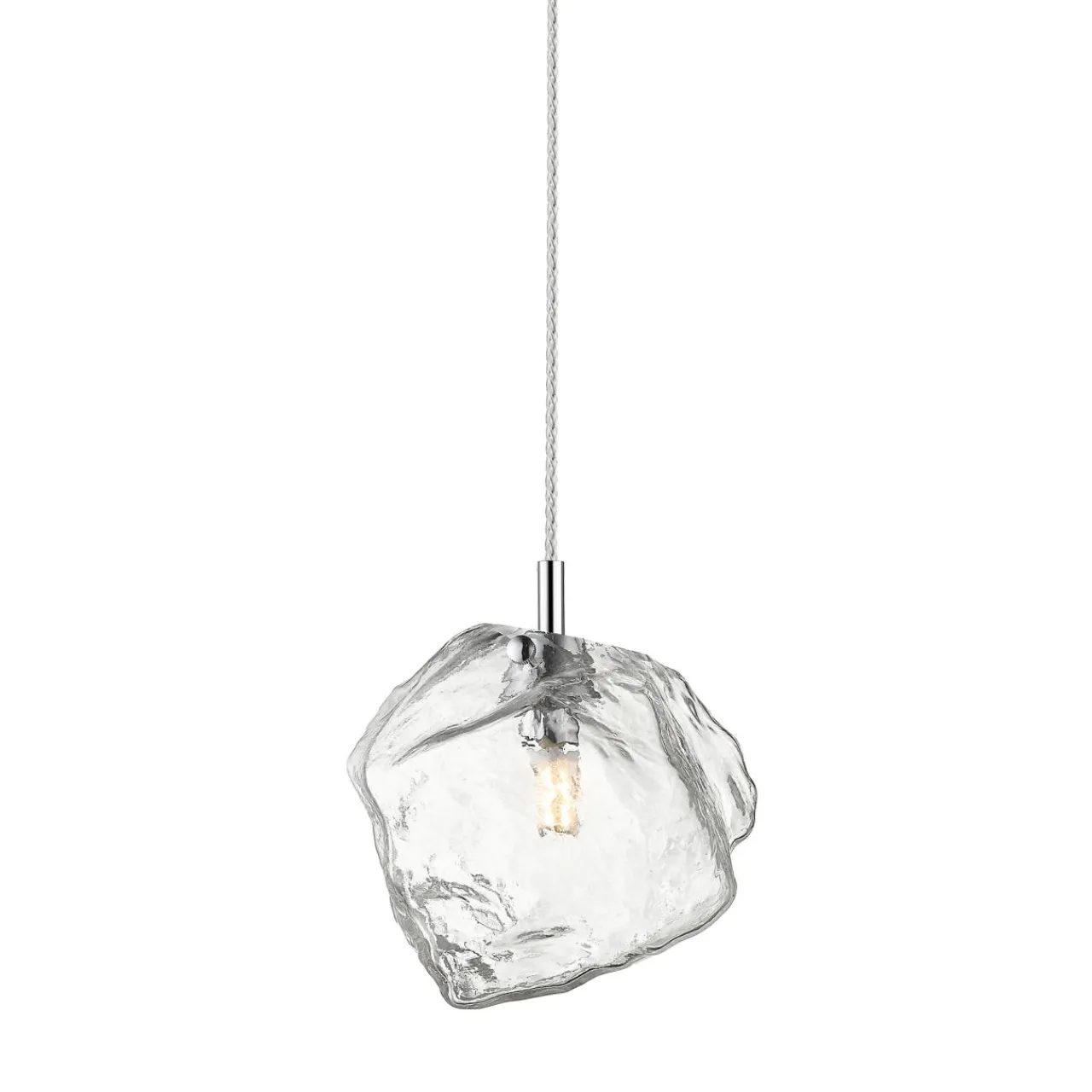 Przeźroczysty szklany klosz przywodzący na myśl fragment skały dodaje kolorytu i urokliwie wygląda w połączeniu z ozdobną żarówką. Podstawa lampy została wykonana z metalu. Na uwagę zasługuje chromowane wykończenie, które optycznie rozjaśnia całość.