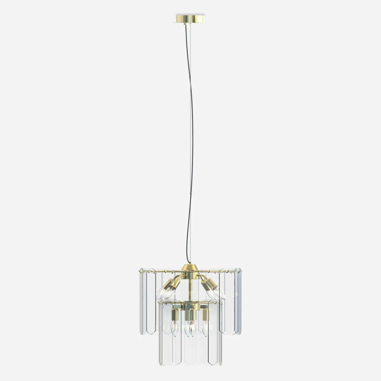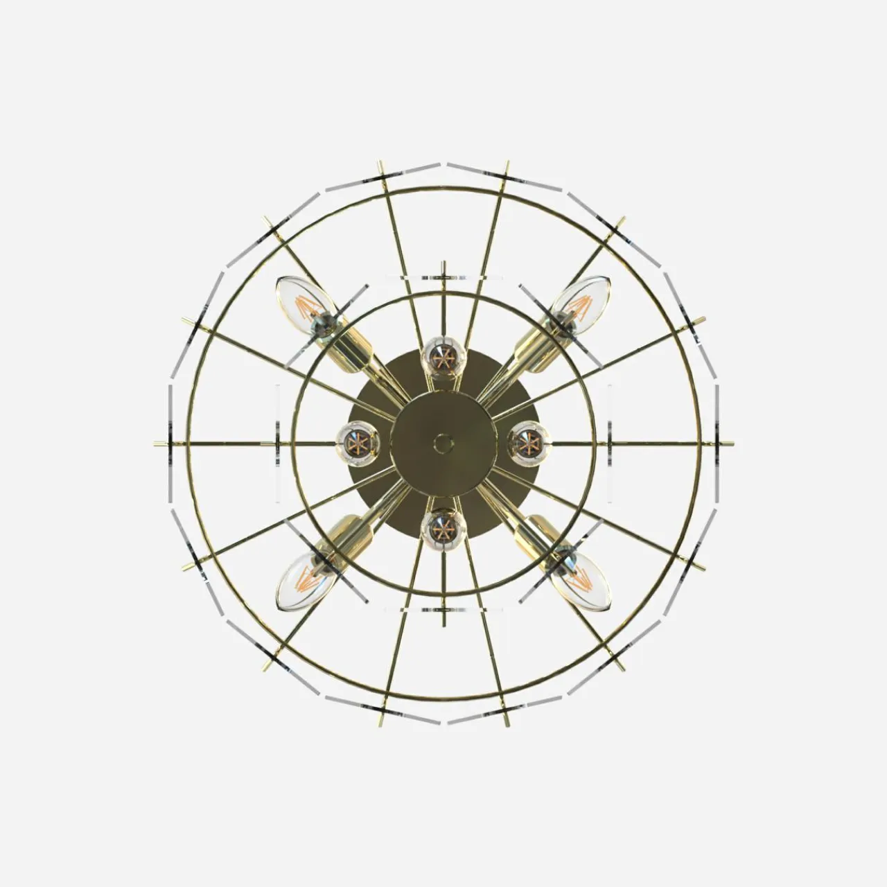 - Modny kształt lampy oparty jest ozdobach o regularnym kształcie, wykonanych ze szkła. Wykończenie lampy łączy złoty kolor oprawy z transparentnym kloszem, wewnątrz którego doskonale widać kształty 8 żarówek.
