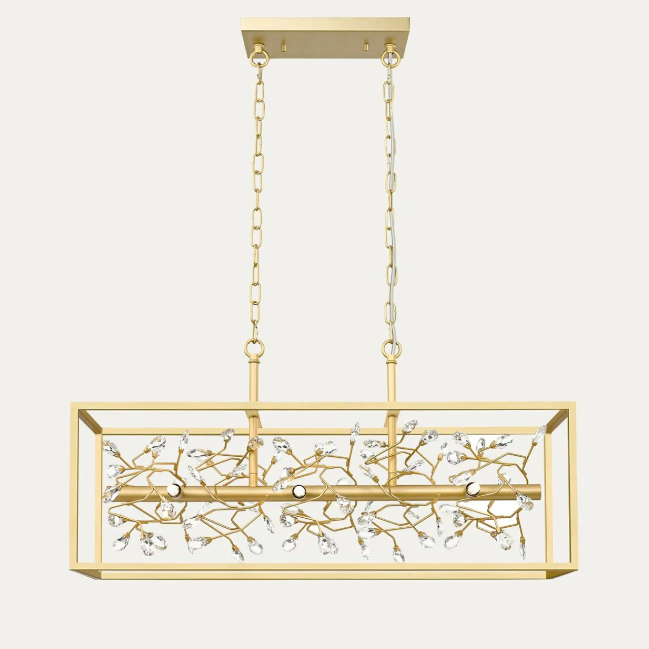 Wiosenna oprawa lampy stylizowana na kwitnącą gałąź podkreślona została akrylowymi kryształkami i zamknięta w prostej, geometrycznej formie oprawy.