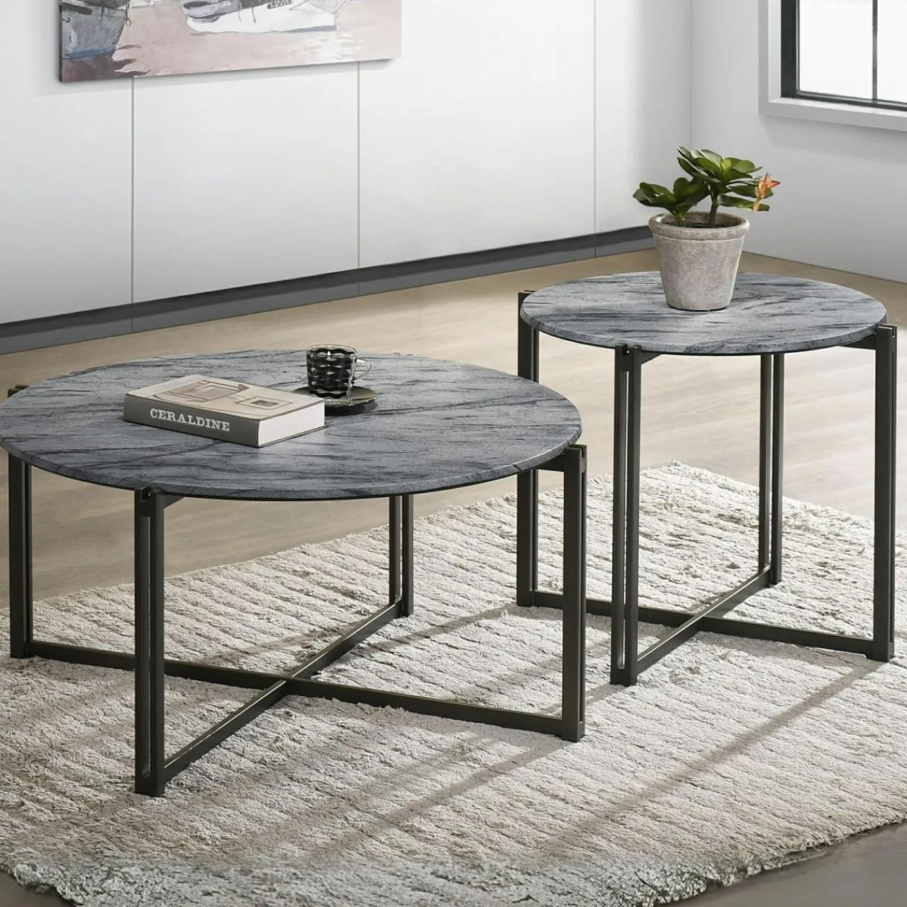 - Marmurkowy wzór blatu w kolorach czarnym i szarym ozdobi Twoje wnętrze w stylu nowojorskim i nowoczesnym. Świetnie wygląda wśród beżowych lub szarych ścian, dodając luksusu w pokoju dziennym.