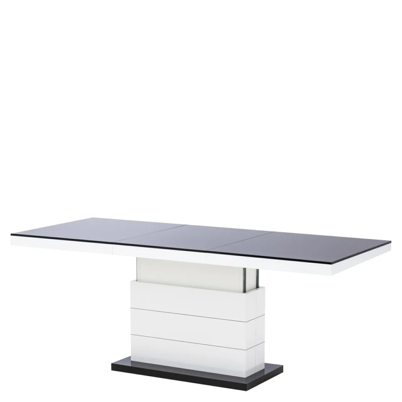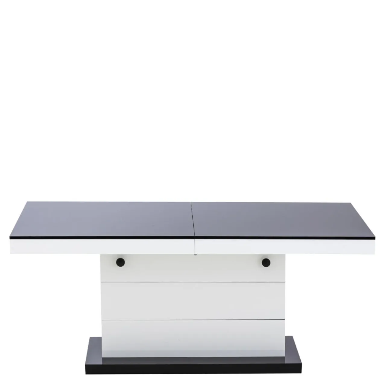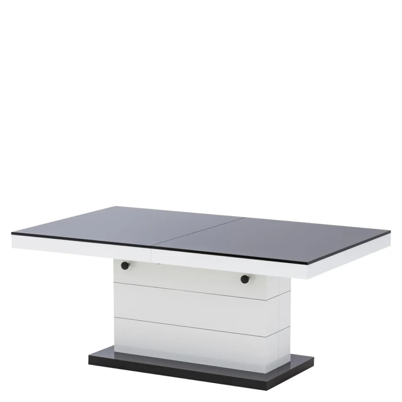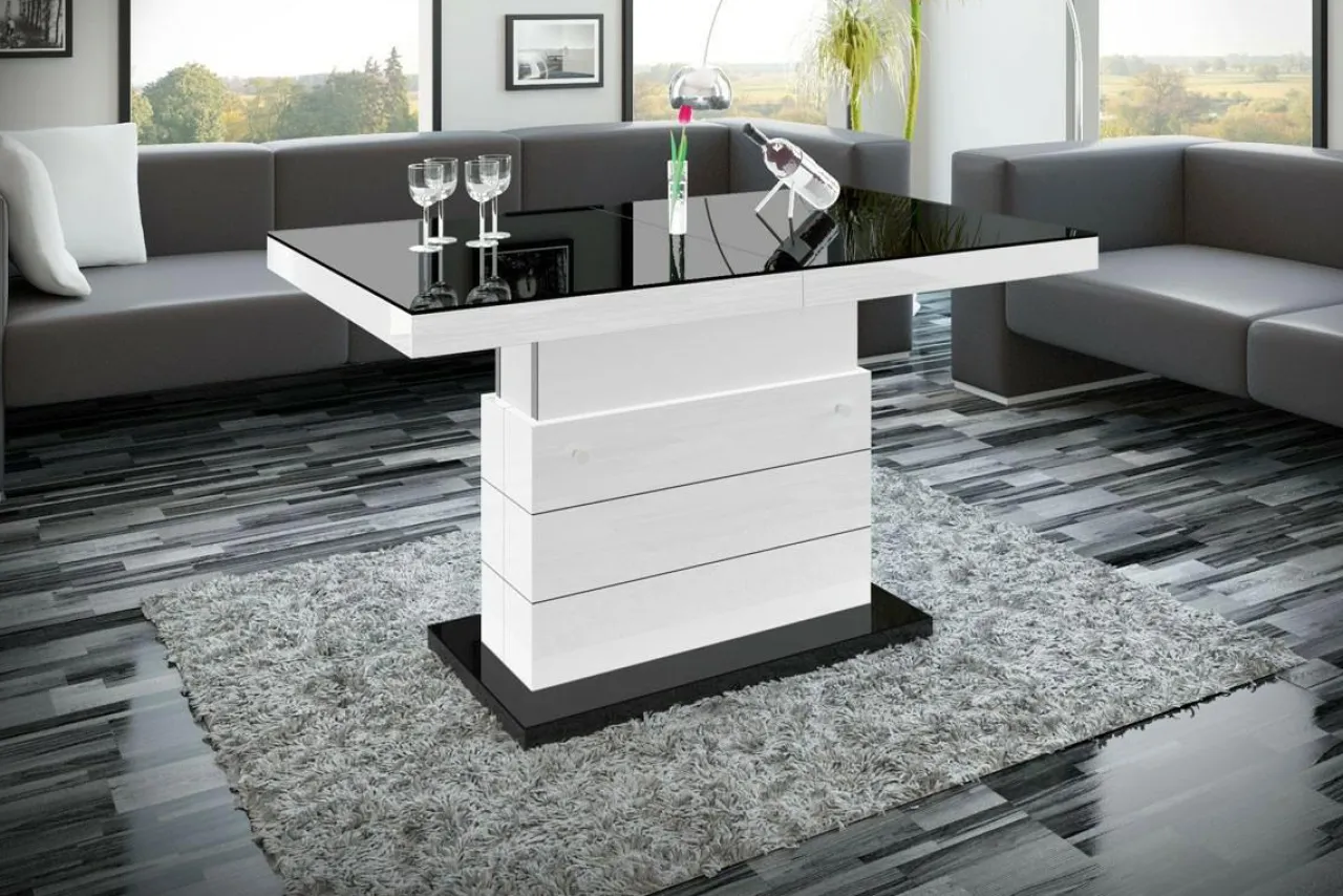 Podnoszona i rozkładana ława MATERA LUX to nowoczesny dodatek do salonu. W modnym połączeniu czerni i bieli, będzie pięknie prezentować się w salonie, ale też w biurze i innych przestrzeniach. Zamiast czterech nóg zastosowano stabilną podstawę z dekoracyjnymi, poziomymi nacięciami. Całość prezentuje się bardzo efektownie, z pewnością zachwyci twoich gości. Blat ma efekt lustrzanej nawierzchni dzięki wykończeniu na wysoki połysk. Mebel dwa w jednym na pewno przyda się w niewielkich wnętrzach.