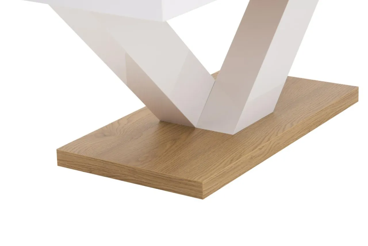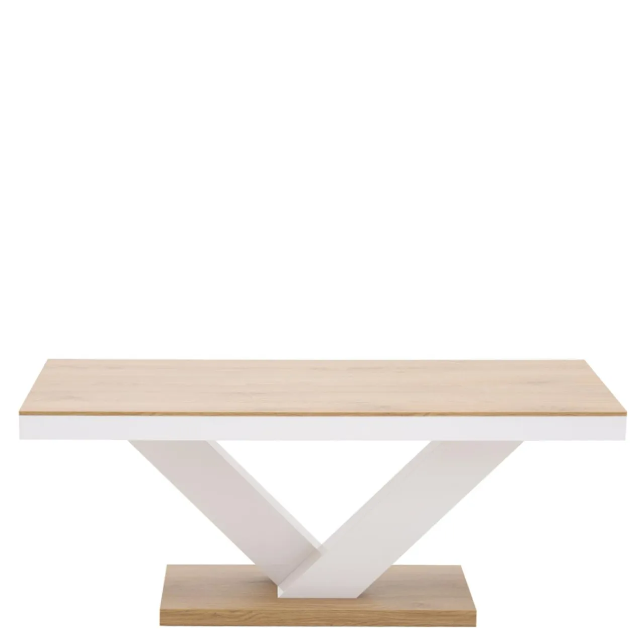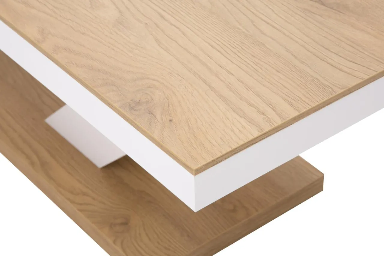 Ława ma białą podstawę i blat w kolorze jasnego drewna. Świetnie sprawdzi się w kąciku wypoczynkowym postawiona przed szarym narożnikiem lub sofą.