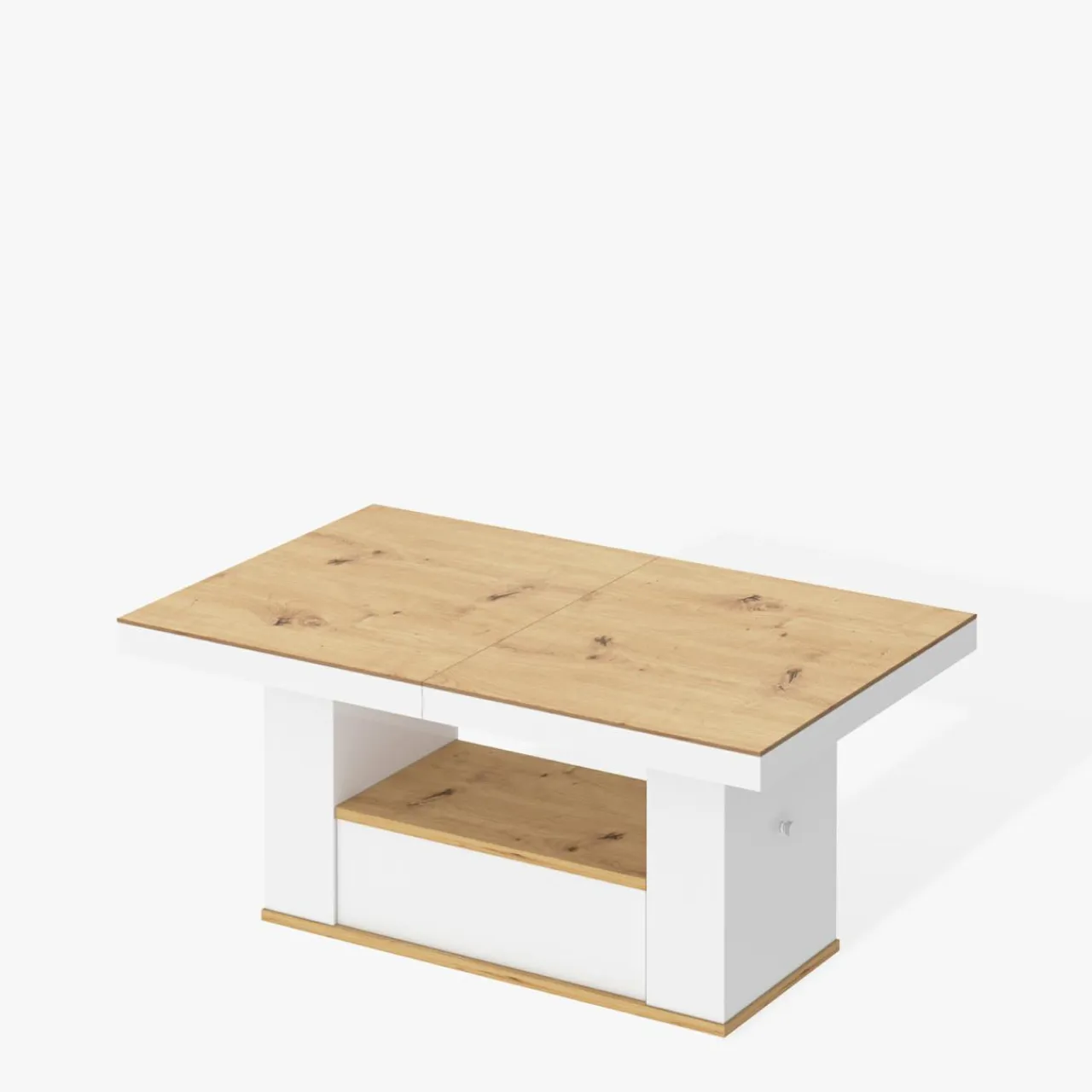 Blat i podstawa w laminacie dąb artisan tworzą ciepły akcent, a podstawa i front szuflady w białym połysku dodają nowoczesnego stylu.