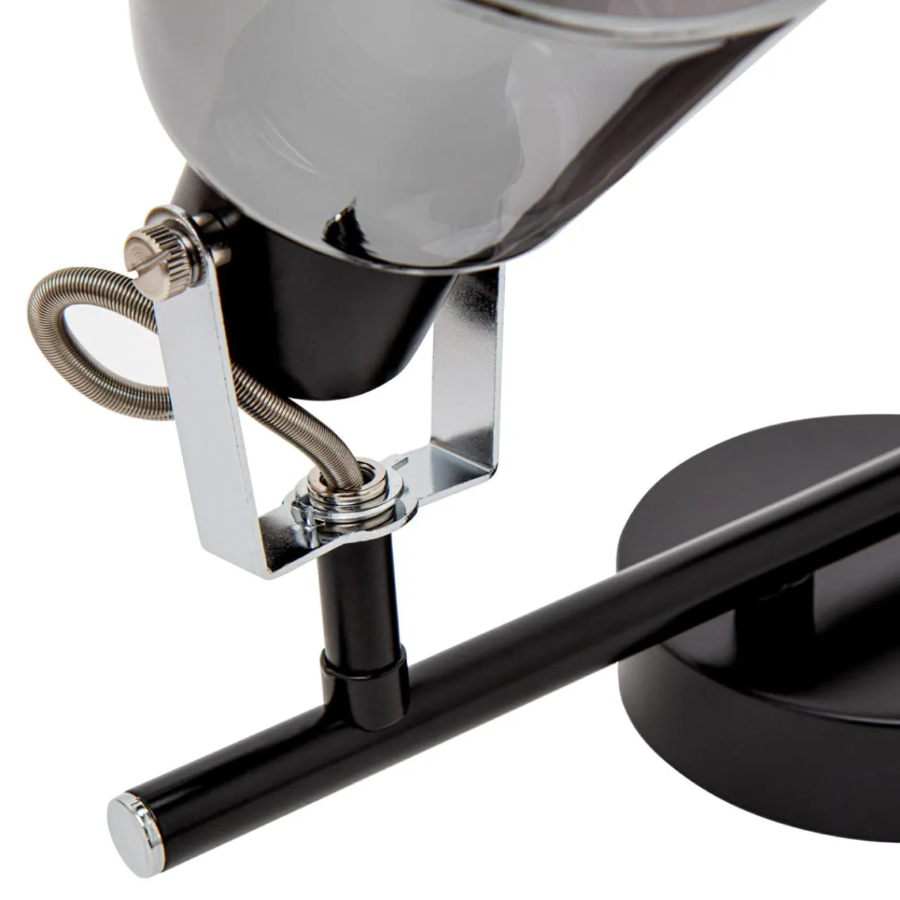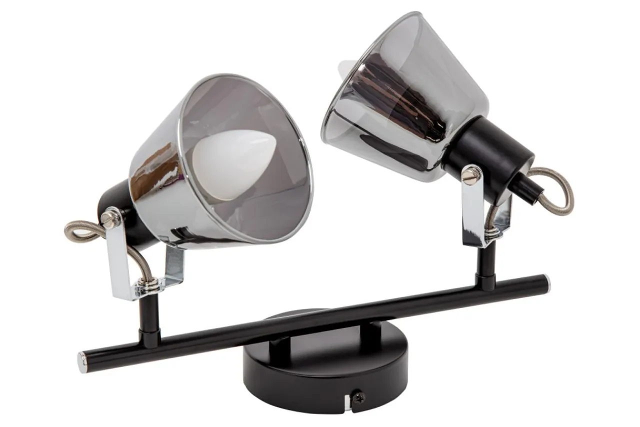 Posiada metalową podstawę w czarnym kolorze oraz 2 transparentne, szklane klosze o kształcie zbliżonym do tradycyjnych lamp biurkowych.