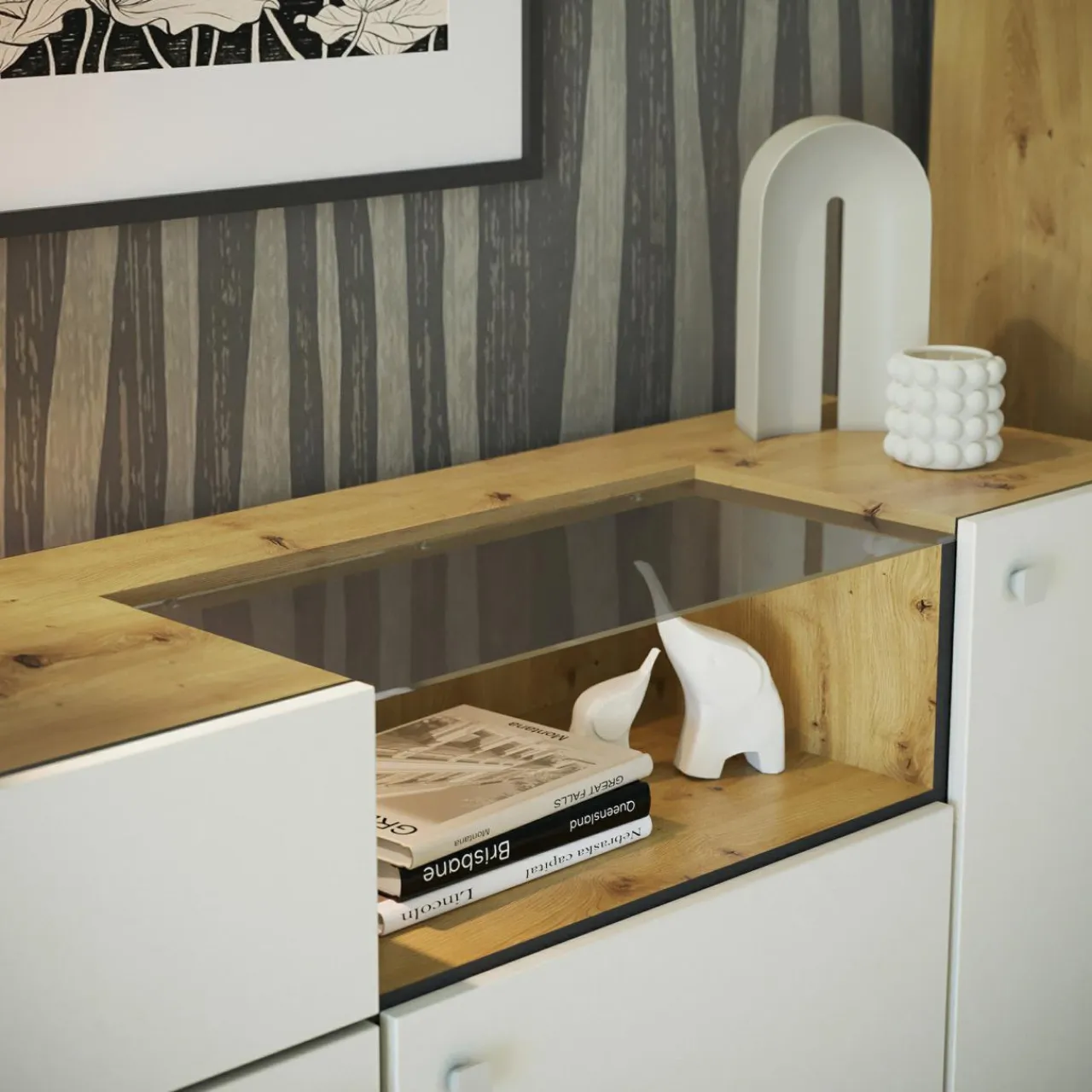 - Otwarta wnęka pod przeszkloną częścią blatu to świetne miejsce na Twoje ulubione przedmioty. Możesz dodatkowo je uwydatnić, dokupując oświetlenie.