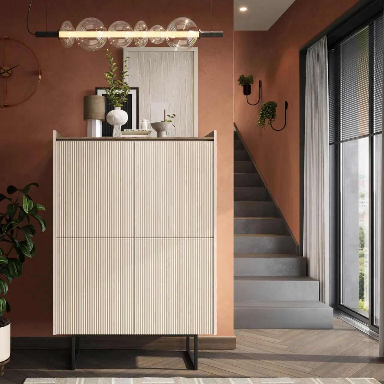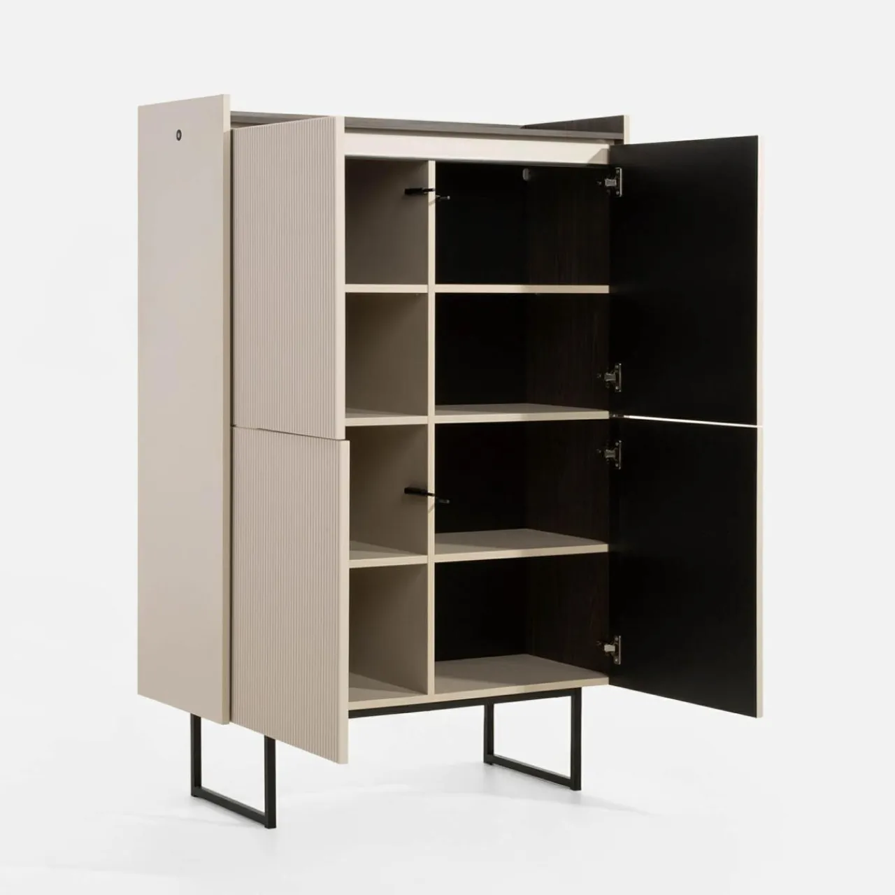 Wysoka komoda LAGO odnajdzie się w salonie lub jadalni. 4 drzwi kryją za sobą mnóstwo miejsca na dokumenty, obrusy czy zapasową pościel.