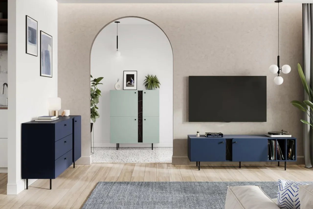 - Szałwiowe meble świetnie sprawdzą się łagodnej, industrialnej aranżacji. Surowa ściana, marmurkowe dekoracje to idealne tło. Dołóż pnące się rośliny, drewniane palety i czarno-białe dodatki, a uzyskasz efekt artystycznego salonu.